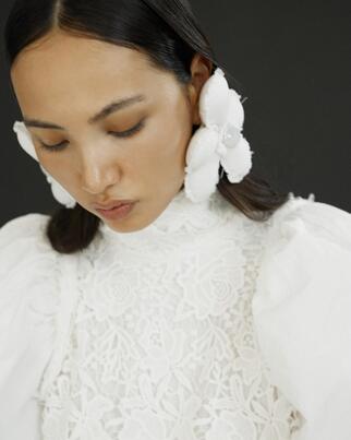 Цветы — сюрприз — все еще самый популярный свадебный мотив, даже среди самых прогрессивных зумеров. Поэтому, если душа (и образ) требует ромашек в ушах или на лацканах, не стесняйтесь. Впрочем, если ваши отношения больше описывает брошь в виде пронзенного иглой анатомического сердца — вперед: «личные» украшения, согласно аналитикам Pinterest, тоже в моде.