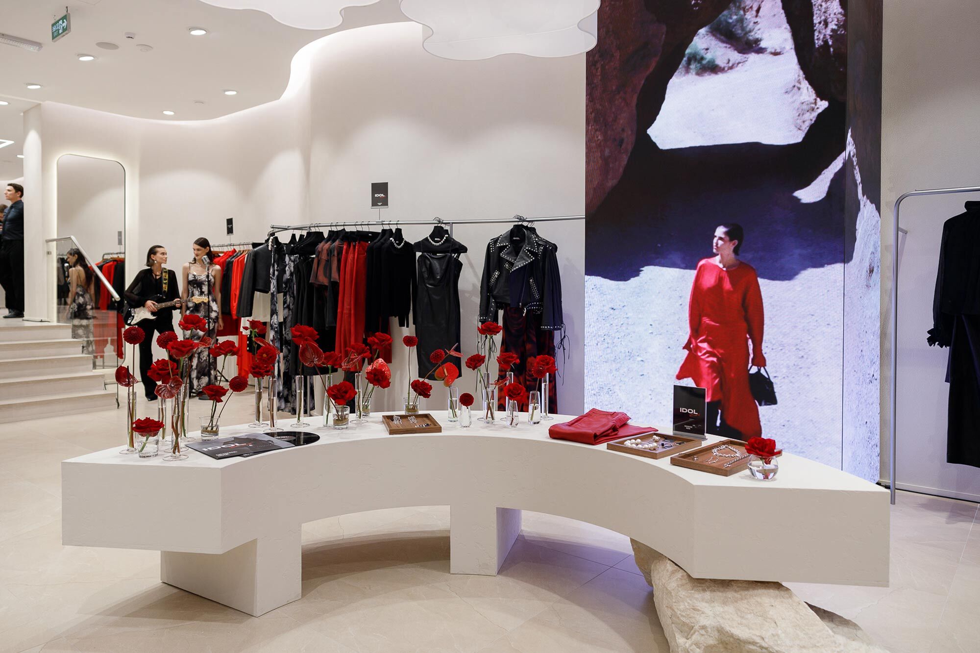 У IDOL интерьер минималистичный, но запоминающийся: камень и дерево в отделке, акцентный дизайн, сильные стенды с аксессуарами, дизайнерские предметы декора. Дизайн скорее напоминает современные арт-пространства. Здесь ничего не отвлекает (а лишь подчеркивает) главные экспонаты — одежду, обувь и аксессуары. Такой подход усиливает вовлеченность и формирует эмоциональную связь с покупателем. Как следствие покупки в магазине становятся событием, которое хочется повторить.