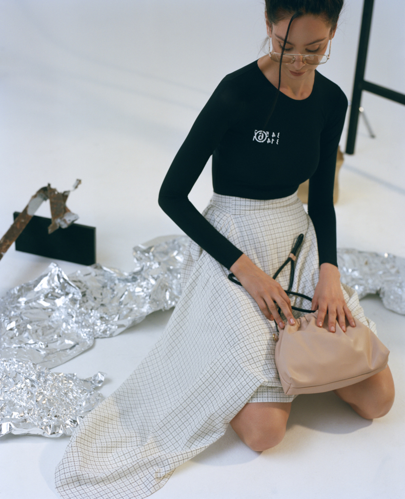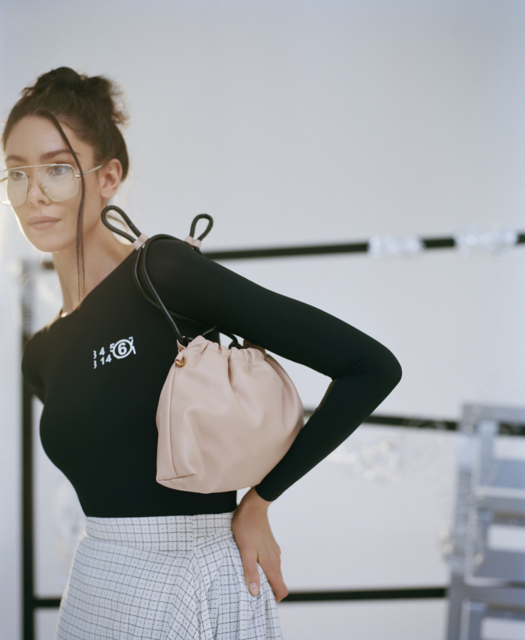 В этом образе ничего не помнется и не испачкается — с таким принтом на блузе будут незаметны никакие пятнышки. А платок, встроченный в шов, — вещь уникальная. Его можно завязывать разными способами и играть с силуэтом. Я практически не ношу сумки, но на свидание взяла бы. С ней и ее содержимым я чувствую себя безопаснее, ведь никогда не знаешь, чем закончится встреча. Поэтому я выбираю вместительную модель.
