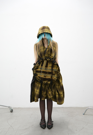 Прелесть апсайкла — в неограниченных возможностях. Работая с вторичным сырьем, Дина приоритизирует фантазию формы и масштаба над функцией во втором цикле жизни одежды. К примеру, берет погремушку как форму-прототип, гиперболизирует ее и создает аксессуар для головы и груди.