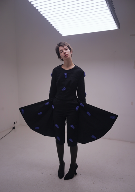 В своей коллекции Анна использует бракованные айтемы MAAG, возвращая их обратно в цикл использования из состояния изъятости и наращивая цикл жизни вещей, — как в ее декоративных нарукавниках.