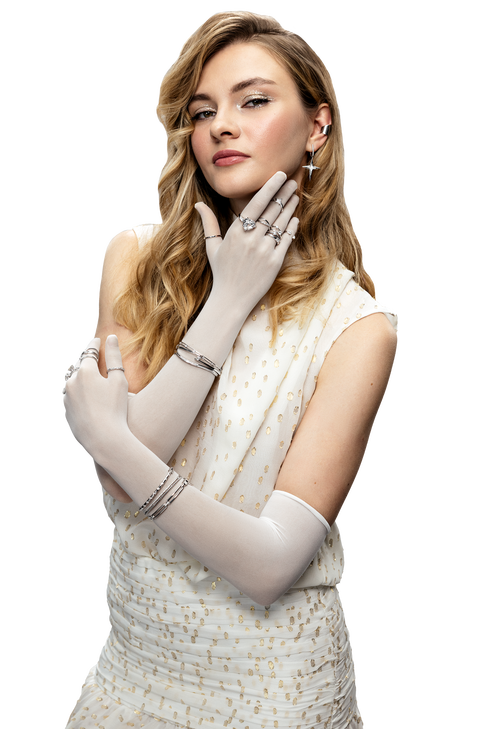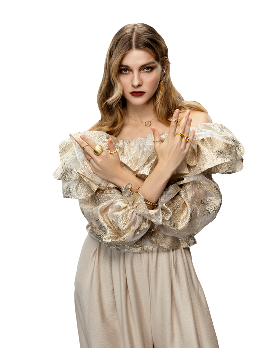 Есть девушки, которые даже зимой сияют ярче солнца — теплые, жизнерадостные, умеющие радоваться мелочам. Они похожи на жар-птицу из сказки — олицетворяют то состояние души, которое другие персонажи только мечтают заполучить. Если и в реальных образах вам присуща легкость и свобода, то стиль бохо, эклектика и 70-е, которые стали особенно популярны благодаря обновленному Chloé Чемены Камали, помогут проявить вашу творческую энергию. Новогодний аутфит не исключение — например, можно сделать акцент на воздушную блузу с рюшами и дополнить ее витиеватыми серьгами с муассанитами или несколькими браслетами-каффами из новогодней коллекции Panacea.
