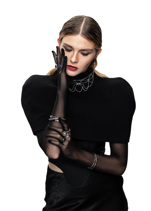 В русских сказках Баба Яга — хитрая и остроумная. Она точно знает, чего хочет, и уверенно управляет своей судьбой (и чужими тоже). Также и в современном мире женщина, которая не боится показать все свои грани, обладает особенным магнетизмом и внутренней целостностью. Если вы признаете двойственность и многогранность своей натуры, попробуйте примерить украшения в стиле dark romance. Его воспевают в Simone Rocha, Magda Butrym и Alexander McQueen. А еще он становится популярен благодаря кинематографу — мы только недавно восхищались стилем Дженны Ортеги на премьере нового сезона «Уэнсдей», а теперь рассматриваем костюмы прогремевшего на весь мир «Франкенштейна» Гильермо дель Торо. Готика и темная романтика — отличная альтернатива привычному новогоднему образу, и его как нельзя лучше дополнят колье в виде паутины, серьги с крестами и драматичные кольца с кистями рук из новой коллекции бренда Panacea.