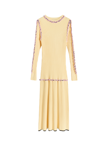Сам термин «брутализм» происходит от французского béton brut — буквально «грубый, необработанный бетон». Бруталисты говорили о необходимости честного использования материалов и правдивого отражения конструкции в структуре зданий. Бетон оставляли без отделки, иногда со следами опалубки, не скрывали даже водопроводные трубы и подводку для сантехники — в рамках брутализма такая «честность» была осмыслена как часть эстетики. Reserved и Моника Бродка интерпретируют эту особенность архитектурного стиля с помощью трикотажных изделий. Платья и лонгсливы в коллекции декорированы цветной строчкой — нитки контрастного цвета создают красивый эффект незавершенности.