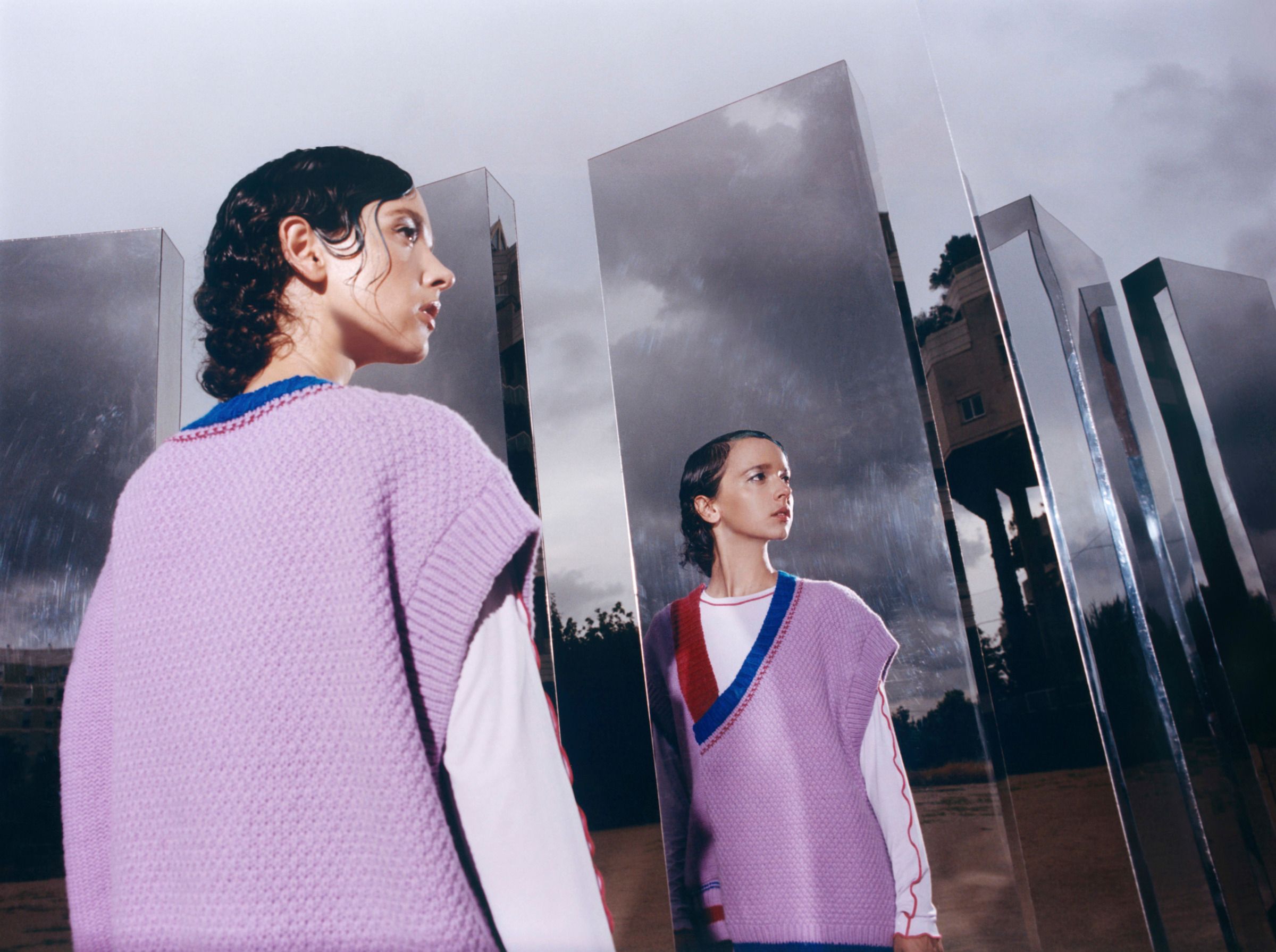 Для фасадов бруталистских зданий характерен сложный ритм лестниц, балконов и окон, которые словно задают постройке движение. Резкий ритм проявляется на одном из джемперов Reserved — красно-голубой рисунок повторяет окна бруталистских построек в Польше 1960-х и 1970-х годов. Для совместной коллекции с Моникой бренд разработал еще несколько динамичных ярких принтов. Можно облачиться в них с головы до ног, выбрав трикотажный костюм, или добавить в осенний образ лишь графичные штрихи — например, с помощью красочного шелкового шарфа и носков.