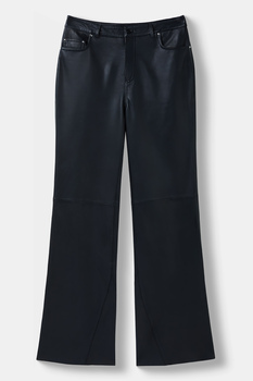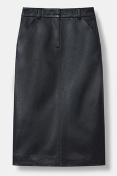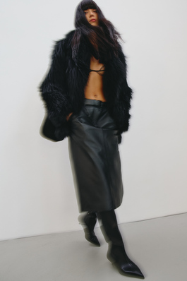 Сочетание объемного верха с узким низом все еще в ходу. Черный меховой жакет носите с миди-юбкой и приталенным платьем из кожи, вместительной сумкой и остроносыми высокими сапогами.