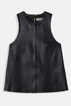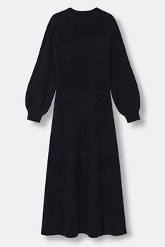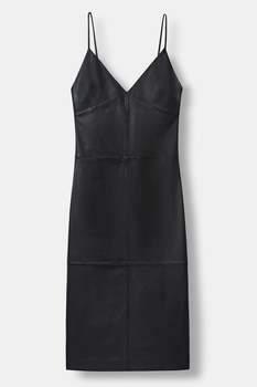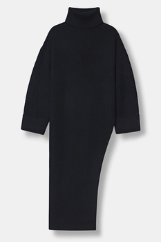 Второй вариант — длинный свитер с высоким вырезом, надетый поверх кожаного миди-платья. Главное — не забудьте акцентные украшения: особенно хорошо будут выглядеть крупные серьги и кольца из золота.