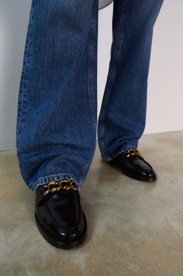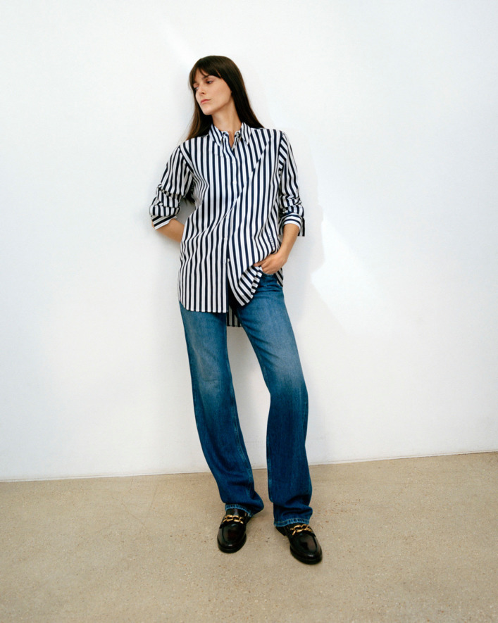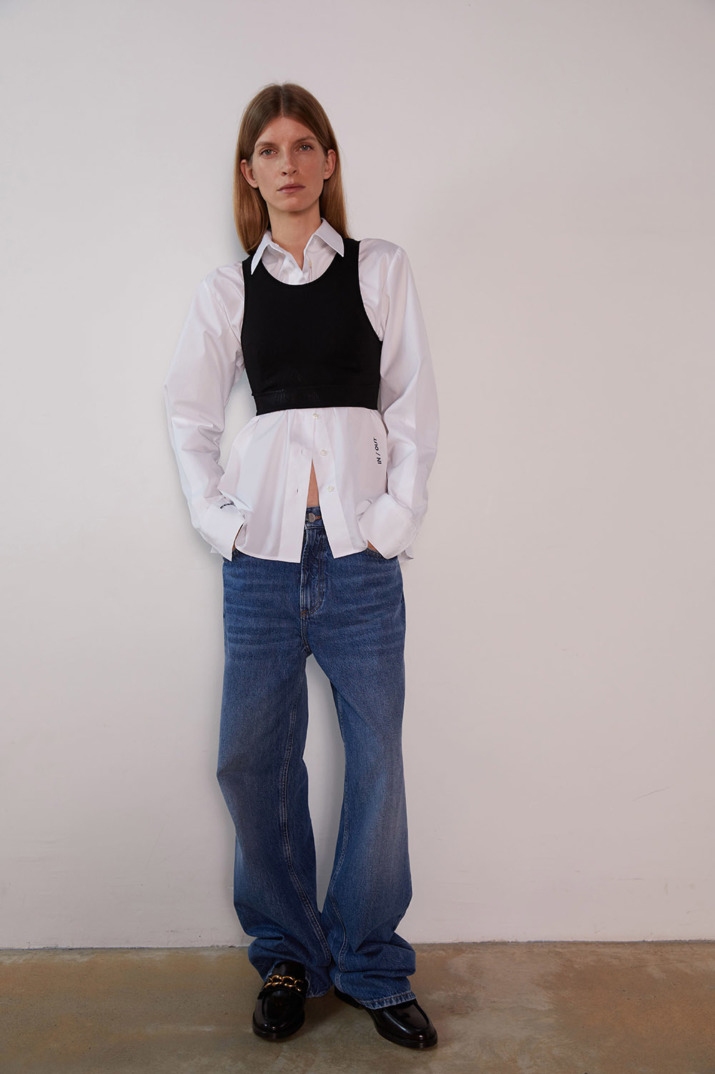 Если оверсайз расслабляет, то парижская классика — собирает. Например, рубашка и костюм свободного кроя. Если хочется многослойности, под рубашку надевайте топ или майку, напоминающую классическую «алкоголичку». Сверху — жакет, вниз — брюки или джинсы клеш, только так, чтобы они не до конца закрывали обувь: желательно черные лоферы с массивной цепью золотого цвета. Если жакеты надоели, топ можно надеть прямо на удлиненную оверсайз-рубашку — нескучная вариация на забытую школьную форму с жилеткой. В таком образе можно и на открытие выставки, и на встречу с друзьями, и на работу.