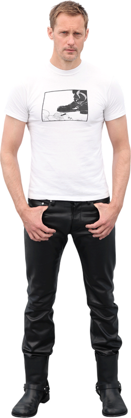 Еще шорты, брендов S.S. Daley и JW Anderson, он выгуливал в Каннах, на заглавной съемке Dust и на утреннем телешоу Lorraine — в комплекте с олимпийкой, рубашкой и галстуком. «Сегодня я хотел выглядеть сексуально. Нет ничего сексуальней мужчины средних лет в форме британского школьника», — сказал он тогда в эфире передачи. При этом трудно представить в трусах на обложке Скарсгарда образца хотя бы начала двадцатых — до встречи с Ламбертом он одевался как образцово-показательный уроженец Стокгольма, истинный скандинавский парень и образец «сканди-бро-стиля» по мнению британского GQ. И носил в основном пальто, водолазки, шерстяные брюки и замшевые ботинки, а футболками с ироничным надписями (вроде той, в которой он появился на шоу Грэма Нортона, — со слоганом hot buffet, или «горячий шведский стол», на груди) в его минималистичном гардеробе и не пахло.