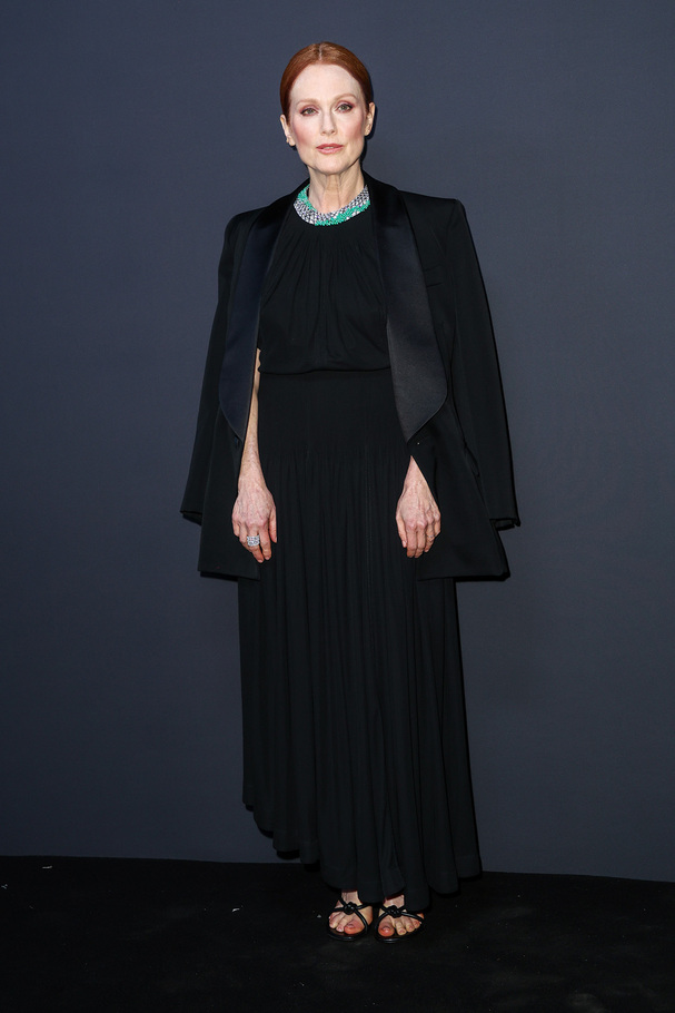 И, к слову, о Saint Laurent. В 2021 году Джулианна вместе с Шарлоттой Генсбур, Хлоей Севиньи и Индией Мур стала главной героиней короткометражки, которую для модного дома снял Джим Джармуш. Тогда стало очевидно, как актрисе идет роковой (какой только у Saint Laurent и бывает) черный и огненно-красный, длина мини и роскошные шубы. Дружба Мур с брендом продолжилась на красных дорожках — правда, прослеживалась в образах менее сексапильных, скорее, по-взрослому, интеллигентно сексуальных: слегка просвечивающем черном макси с кейпом на Gotham Awards 2023 или черном драпированном платье без бретелей с упавшей на локти накидкой-облаком на BAFTA того же года.