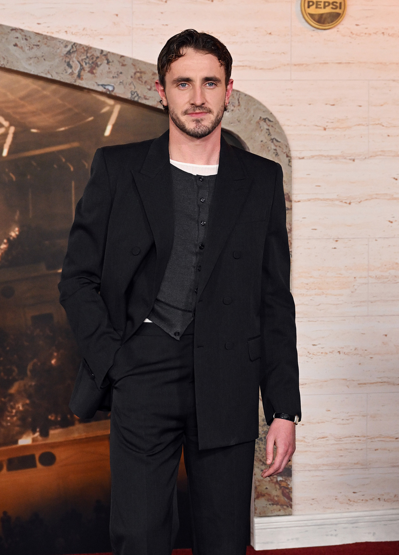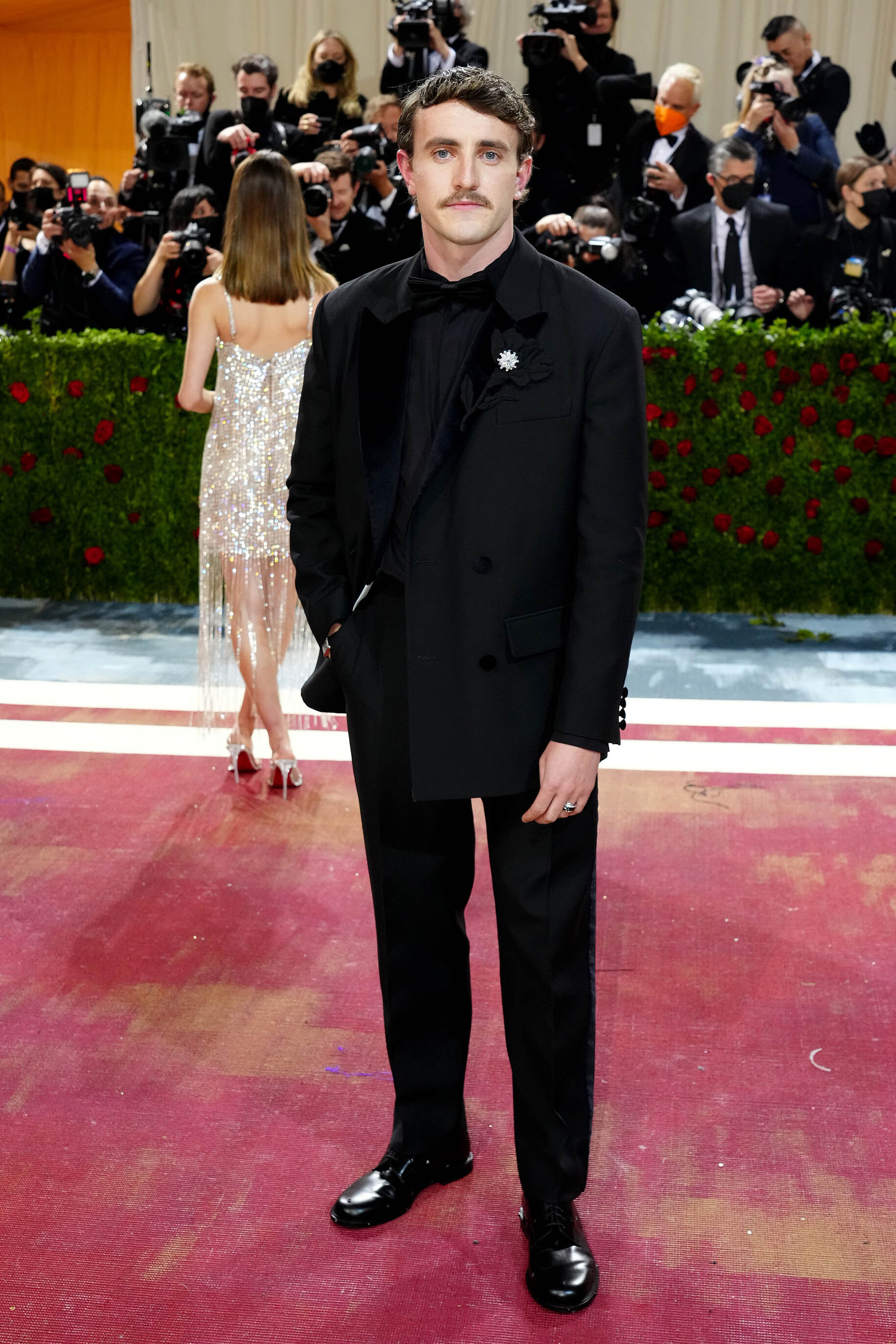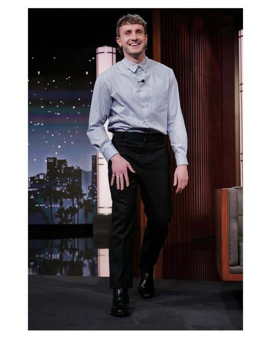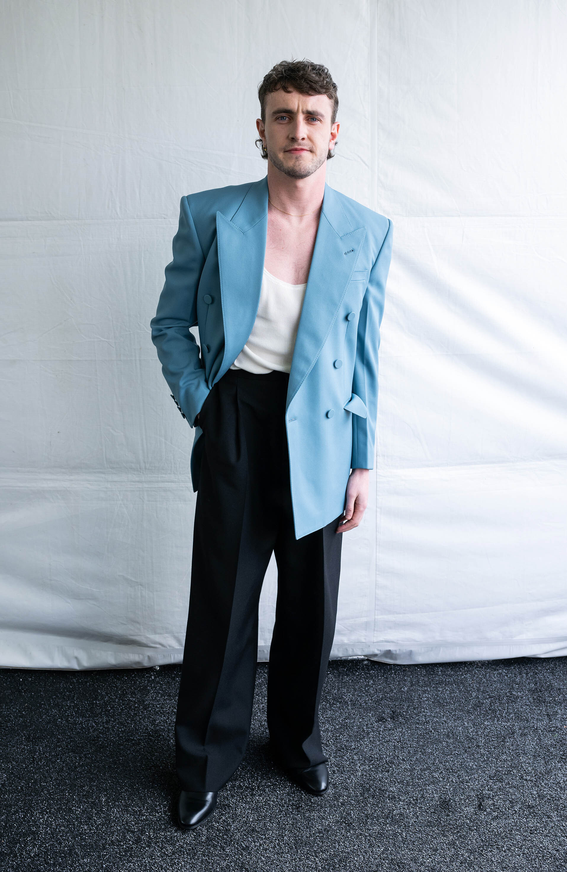 При этом слава, обрушившаяся на Пола после успеха на телевидении и в большом метре — следующим после «Солнце мое» успехом в 2024-м стал «Гладиатор-2», — неизбежно изменила его расписание, в котором появились премии, вечеринки и показы. Последние три года собираться на такие светские рауты актеру помогает стилист Фелисити Кей, которая также отвечает за парадный внешний вид молодых актеров Кита Коннора и Шути Гатвы. «В самом начале работы с Полом мы обменялись множеством референсов, — рассказывала Фелисити Vogue. — Среди них были старые голливудские кадры, винтажные виниловые обложки, архивные редакционные статьи... Я быстро почувствовала, что у него отличный вкус». И так же быстро вывела формулу его идеального выходного гардероба: сшитые на заказ дизайнерские костюмы, мягкие силуэты и винтажные украшения, сдобренные фирменной небрежностью. Первый результат совместной работы Пол и Фелисити продемонстрировали на Met Gala в 2022-м. На красной дорожке благотворительного ужина Мескал появился в черном смокинге Valentino, галстуке-бабочке, неочевидной, но обаятельной рубашке из струящегося шелка и украшениях Cartier (бренда, амбассадором которого он станет годом позже).