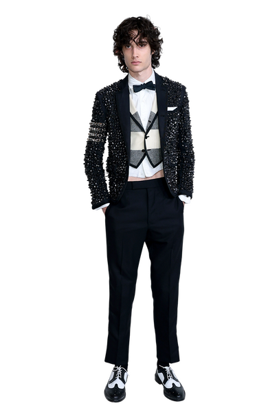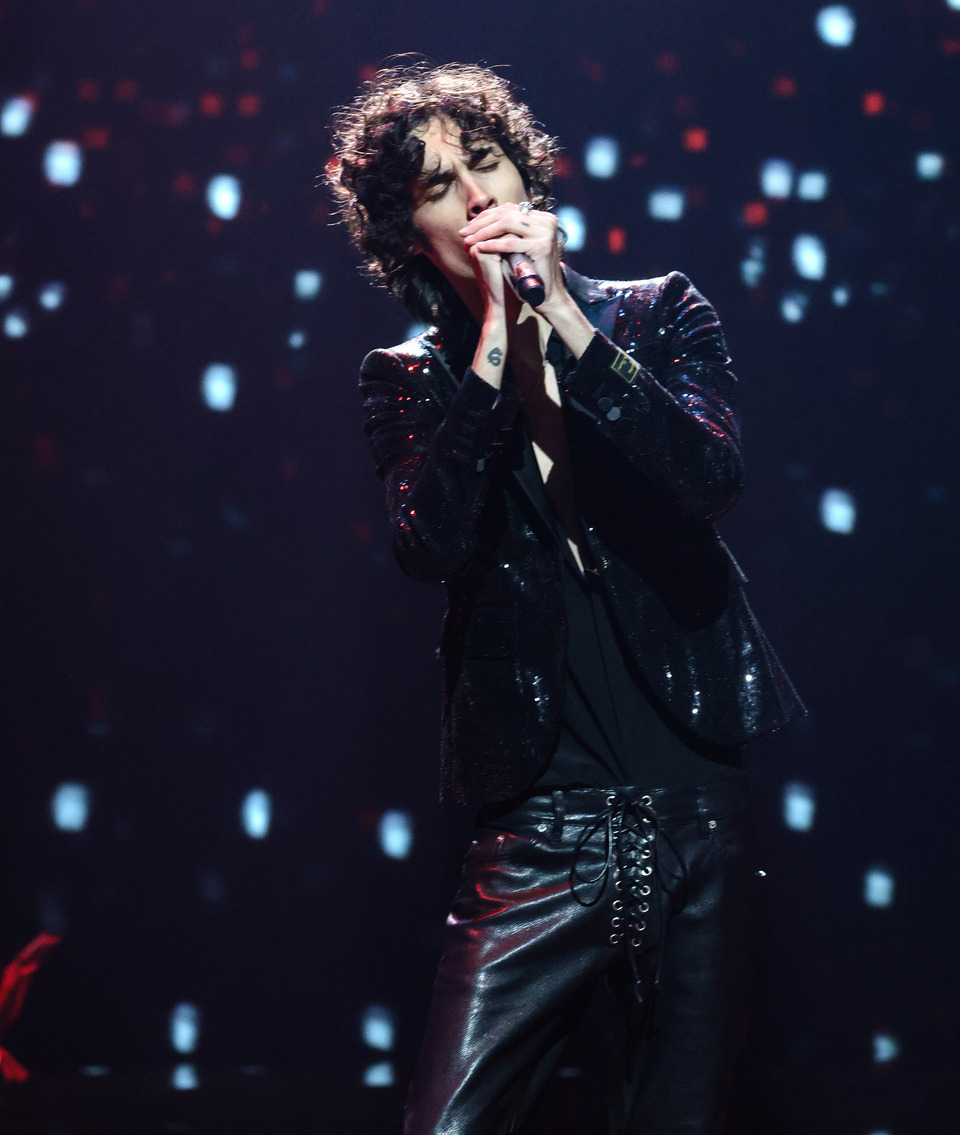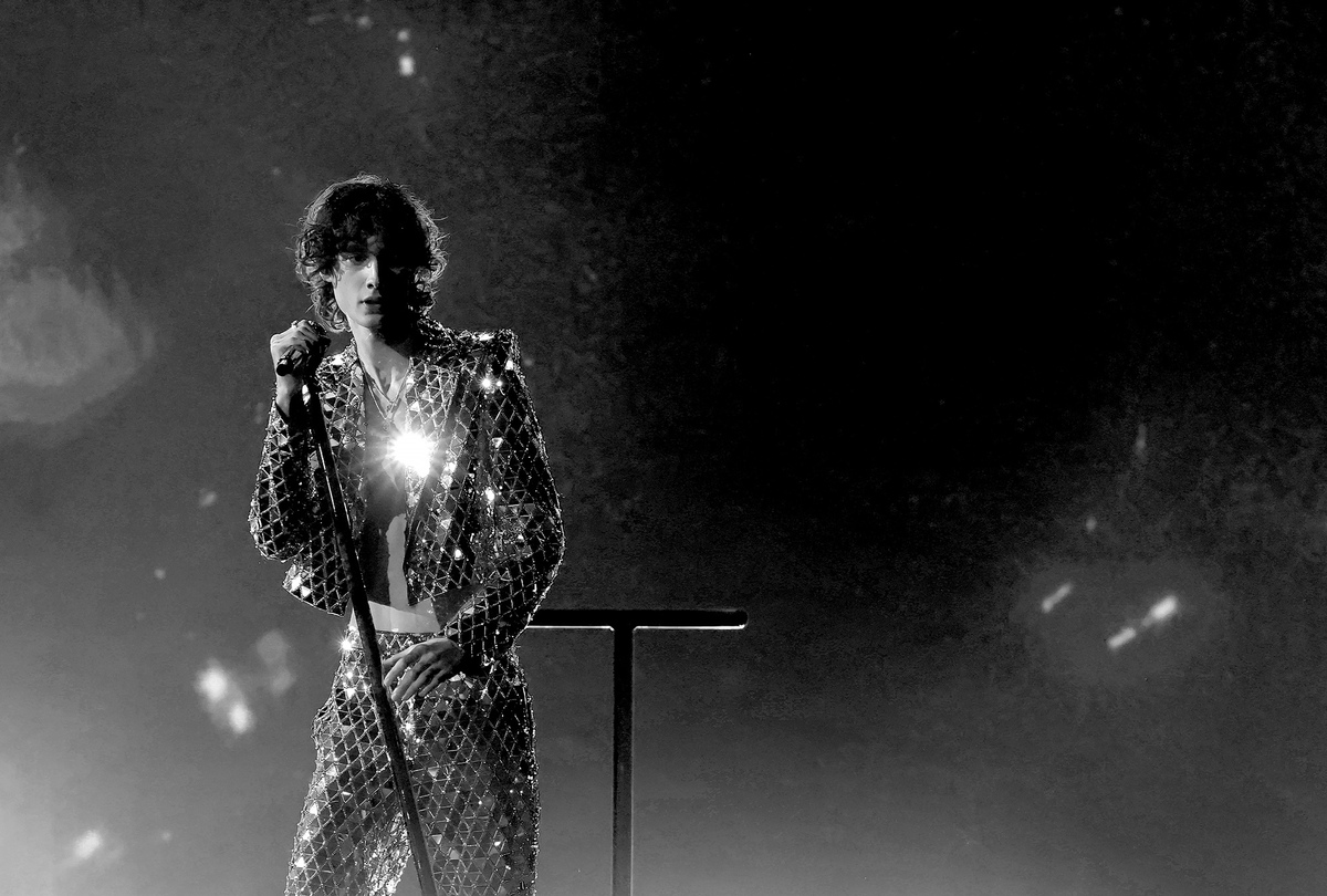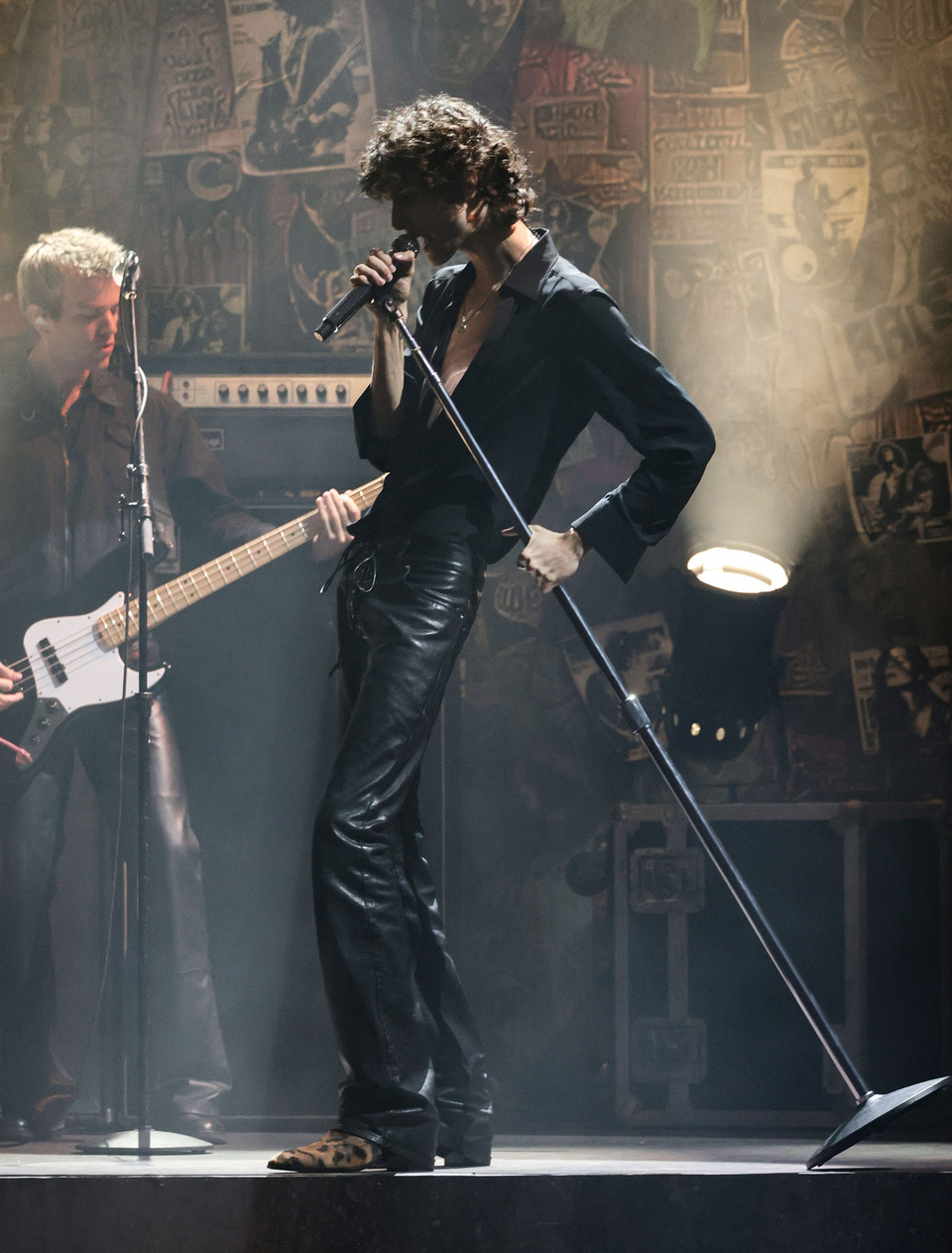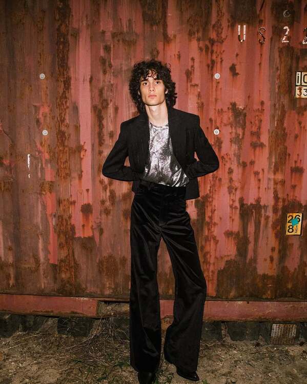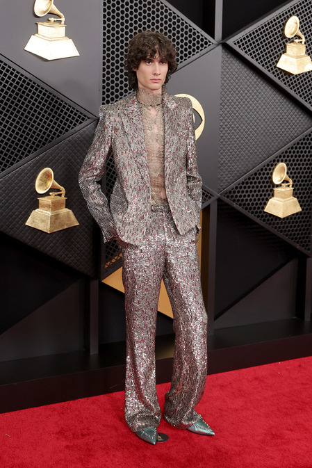 Вообще, его фирменный и даже повседневный образ состоит из мешковатых джинсов или, наоборот, обтягивающих брюк, расстегнутой до пояса или вовсе отсутствующей рубашки, подвески на шее (например, четырехлистника, подаренного ему Свифт), казаков и пиджака — лучше богато расшитого. Взять его сверкающий шипами пиджак Thom Browne на премии CFDA Fashion Awards 2025 или переливающийся пайетками пиджак Valentino на MTV Video Music Awards. В то же время для журнальных съемок Шона частенько наряжают в образы Saint Laurent — модные редакторы весь прошлый год пророчили ему статус амбассадора бренда (раз Celine эпохи Эди Слимана, в которую Sombr вписался бы куда лучше, почил). Певец дуже заседал в первом ряду мужского шоу бренда сезона весна-лето 2026 — но эталонного претендента прямо из-под носа Энтони Ваккарелло уже в этом году увел Алессандро Микеле. Ведь на шоу Vogue World 2025, как и на красной дорожке и сцене Grammy 2026, певец щеголял в Valentino — его костюм, расшитый серебристо-бордовыми пайетками, вошел далеко не только в наш список best dressed.