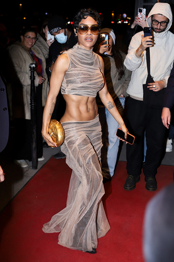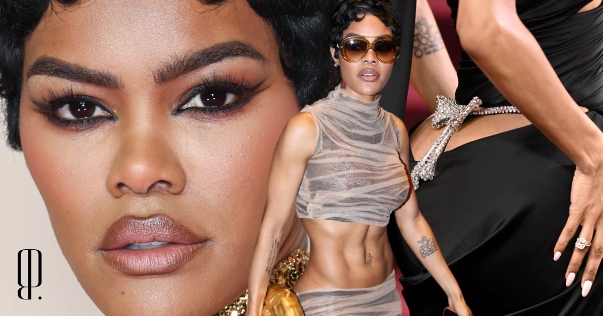 Ну и в целом ее, не побоимся этого словосочетания, поджарая фигура — еще одна гиперфиксация модных изданий. «Сюрреалистическое тело Тейяны Тейлор просто взорвало интернет», — констатировал тот же Vogue еще в 2016-м, когда вышел клип Канье Уэста на трек Fade, в котором актриса три минуты танцует вокруг тренажеров в ретро (то ли спортивном, то ли нижнем) белье. Спустя десяток лет по-прежнему «сверхъестественные рельефные формы», «невероятные изгибы» и «завидно подтянутый пресс» Тейяна на красных дорожках не прячет — благодаря, например, комплектам из коротких топов и юбок на низкой посадке Di Petsa и Oude Waag.