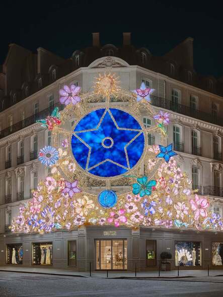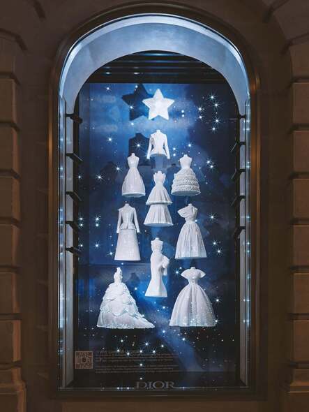В 2025-м Dior вспомнили 2023-й — но теперь соорудили 10-метровое «Колесо фортуны» не на фасаде Saks в Нью-Йорке, а на фасаде собственного «дома» по адресу авеню Монтень, 30, в Париже. Впрочем, раскручиваются на нем все еще важные для бренда талисманы — солнце и луна, бабочки и клевер, звезды и, наконец, знаки зодиака (самого Кристиана, его сестры Катрин, а еще новоиспеченного креативного директора бренда Джонатана Андерсона). При этом в одних витринах расположились образы из круизной коллекции Dior 2026 — созданной еще Марией Грацией Кьюри, — а в других поселились уменьшенные копии знаковых для истории Dior мест — дома Диора в Гранвиле, моста Александра III, самого офиса на авеню Монтень.