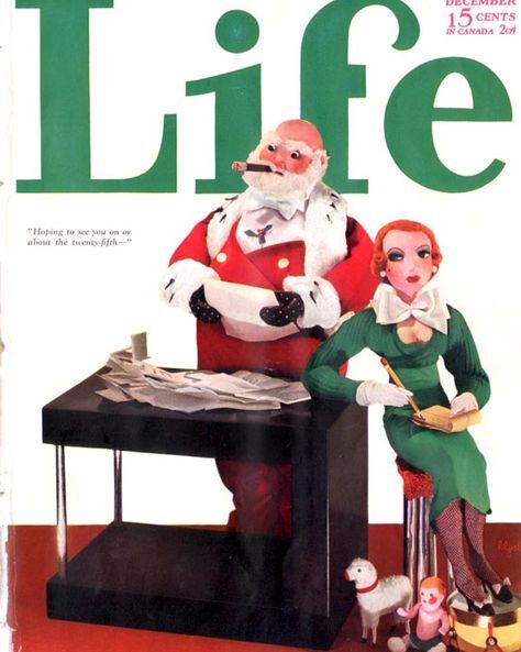 Великая депрессия, начавшаяся в 1929-м, при всей своей разрушительности не смогла поставить на паузу повседневную жизнь, не отменила роскошное потребление, и даже ощущение праздника не упразднила. Наоборот, потребность в нем только выросла. Настолько, что героями декабрьской обложки журнала Life в 1932-м стали Санта и его секретарша, нарисованные скульптором Лестером Габо, который главным образом известен тем, что создал целую серию манекенов для витрин, вдохновленных реальными жителями Нью-Йорка. Кстати, одна из его Галатей стала настоящей звездой светской жизни Нью-Йорка: манекен Синти периодически посещала театры, рестораны и концерты.