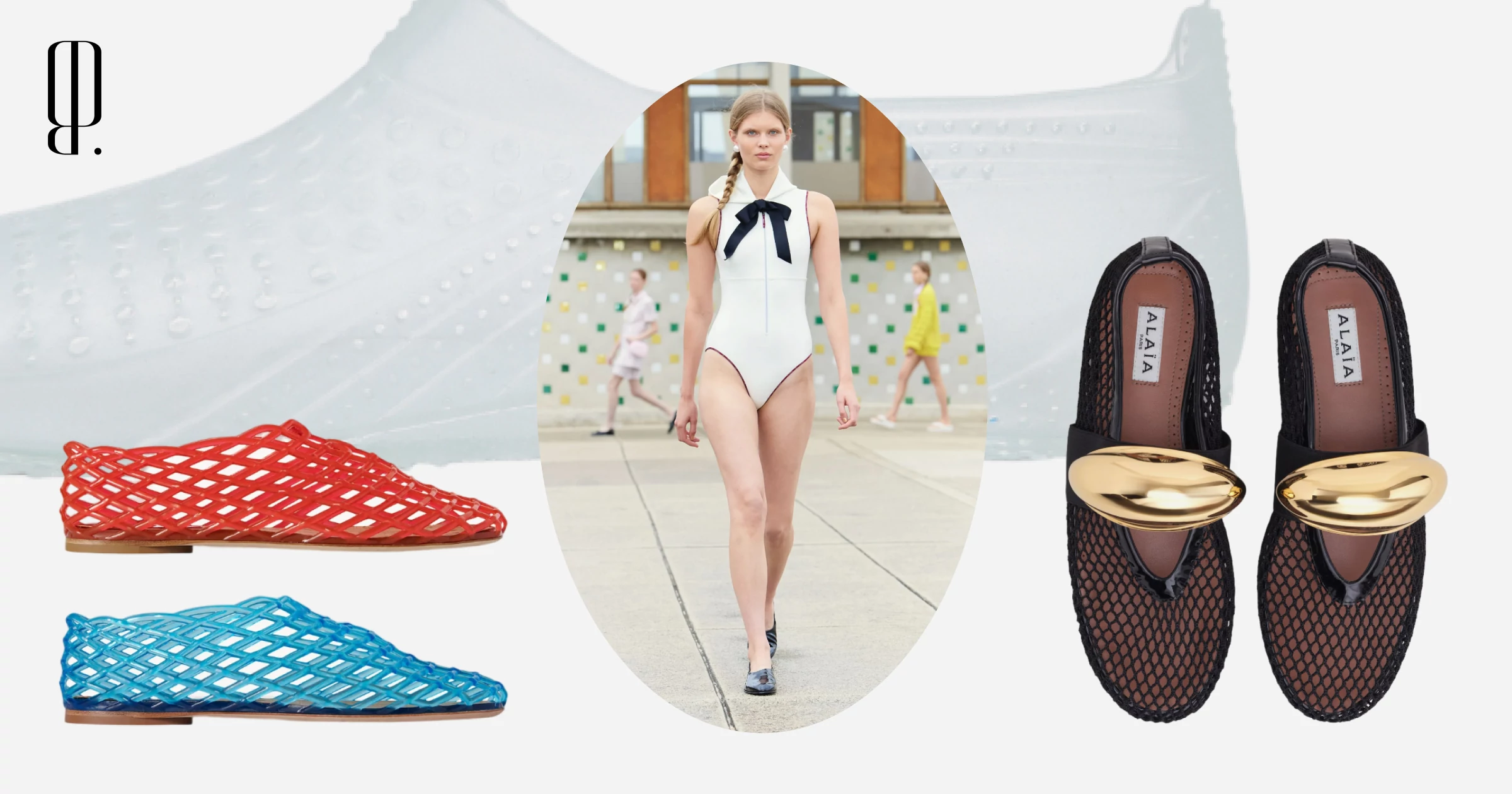 Словом, рыбак вы, завсегдатай галечных пляжей или ни тот, ни другой — этим летом смело переобувайтесь в «мыльницы». Подобную обувь прямо сейчас предлагают не только Chanel, но и, например, The Row — их модель из виниловой сетки еще больше напоминает лучшие советские образцы. И судя по лукбуку, отлично ладит с романтичными платьями, строгими юбками и какими угодно плащами. Из пластиковой сетки (правда, в обрамлении телячьей кожи) выполнены и хитовые «Мэри Джейн» Alaïa — тоже вполне себе вариация на тему. Впрочем, самый верный (и бюджетный) способ приобщиться к тренду — заглянуть в ближайший «Спортмастер». Там модную обувь можно найти под нехитрым названием «аквашузы» или «тапочки коралловые».