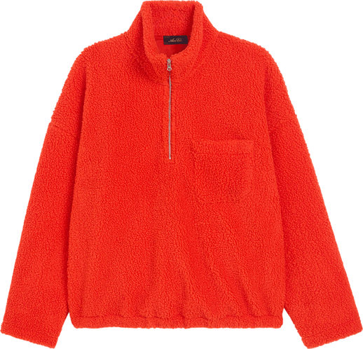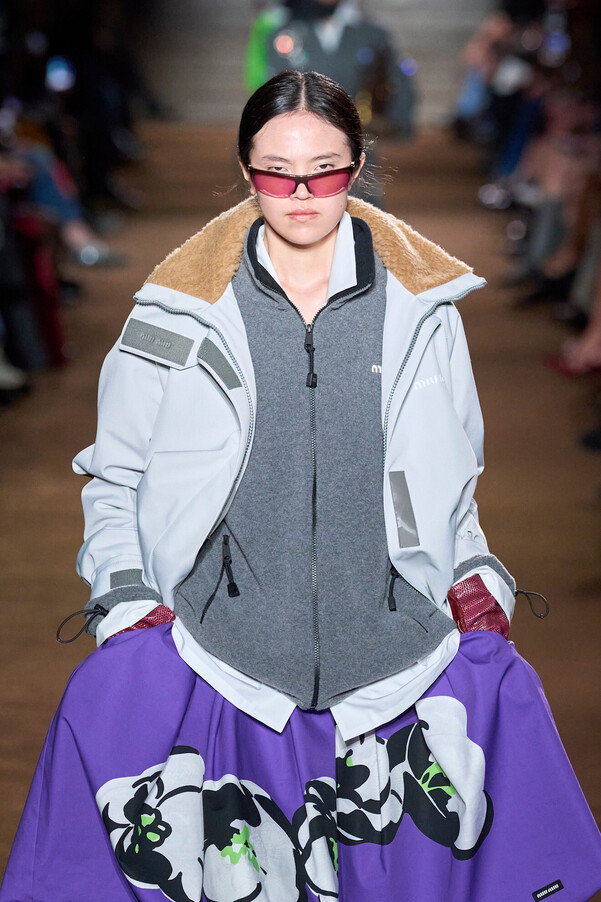Разумеется, завидев успех такой простой и дешевой в производстве вещи (полиэстер, на 20% — переработанный), Miu Miu повторили флиски на шоу и осень-зима 2025/2026, и весна-лето 2026. Бежевые, цвета сливочного масла, снова мышиные, они шли в тандеме с яркими трикотажными топами, шерстяными клетчатыми юбками-карандаш и фартуками в цветок. Одновременно всех порадовали жизнеутверждающие флиски на осенне-зимнем шоу Sandy Liang — розовые, салатовые, небесно-голубые, дополненные крупными жемчужными бусами и юбками с атласными бантами или в горох. А еще бирюзовые толстовки на показе японского (и горячо любимого модным фотографом Анастасией Рябцовой) бренда Auralee: они дополняли шерстяные серые макси в пол. Из последних проявлений тренда — коллаборация Martine Rose с Napapijri, спортивным брендом родом из Итальянских Альп; жемчужина коллекции — флиска в бирюзовый цветок, которую бренды уже выпускали в 2018-м.