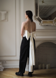 «Мне кажется, тренд на банты — это такая симуляция детства: наше уже платежеспособное поколение ностальгирует о беззаботности нулевых, обожает пересматривать мультфильмы детства (я вот только завершила второй сезон „Чародеек“, все героини которого носят бантики) и ромкомы о светлой школьной любви. Все сошлось: хочется поиграть в юность и наивность, не скатываясь в них, потому что самоирония никуда не девается, и вообще быть взрослым супер», — объясняет Лера Парфенова. Банты — своего рода проявление эскапизма, считает основательница российского бренда МАЙ МАЙ wear Маргарита Жакевич, одна из самых популярных вещей которого — юбка с отстегивающимся бантом. «Мне кажется, что гипертрофированная женственность в нарядах и вообще стремление наряжаться — это естественная реакция общества на те сложности, что происходят с нами последние годы, — говорит она. — Несмотря на все тяготы, каждой девушке сегодня хочется выглядеть классно, но не каждая готова покупать акцентную, но непрактичную вещь в гардероб. Так пришла идея создать юбку-конструктор c отстегивающимся шлейфом. Днем ты в лаконичном мини из тафты, а вечером достаешь из сумки шлейф с бантом, пристегиваешь его за секунду и получаешь wow-наряд. Этот шлейф создает какой-то магнетически роскошный эффект».