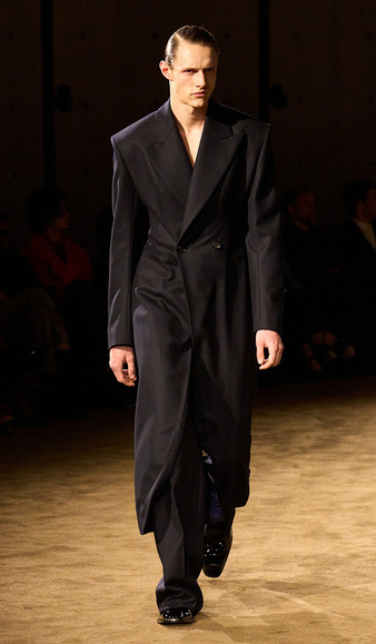 Причины этого у зумеров, понятное дело, калибром меньше, чем у героя, которому они «сочувствуют», но повышение стоимости образования, снижение доступности жилья, безработица, неопределенность, спровоцированная политической обстановкой в мире, и скомканный финал «Очень странных дел» толкают поколение спрятать за пазуху если не топор, то депрессию. А еще, судя по мужским коллекциям сезона осень-зима 2026/2027, надеть длинное черное пальто (можно плащ), немного сгорбиться и нахмуриться. То есть отреагировать на происходящее вокруг примеркой практически классического образа Раскольникова, какой был и во французской экранизации романа режиссера Жоржа Лампена в 1956-м, и в российской дореволюционной — в 1913-м режиссер и сценарист Иван Вронский надел на героя еще и черные брюки в рубчик. Вот и дизайнеры — от Энтони Ваккарелло до Миуччи Прады с Рафом Симонсом — будто попытались по-своему представить главного героя «Преступления и наказания».