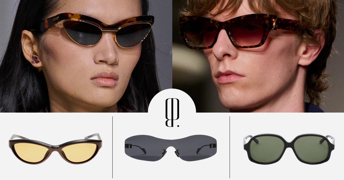 Пожалуй, самая актуальная форма солнцезащитных очков в сезоне весна-лето 2026 — кошачий глаз. Так, на шоу Bottega Veneta почти все оправы были со вздернутыми вверх внешними углами (ради этих очков редактор материала уже открыл накопительный счет). А на показах Iceberg и Junya Watanabe форму кошачьего глаза, чаще свойственную женским очкам, придали и мужским.