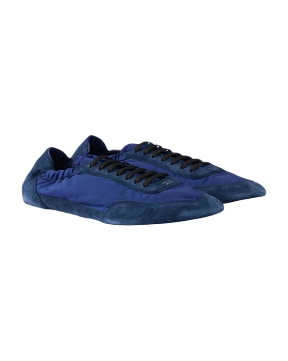 Замшевые кроссовки Prada с нейлоновыми вставками Collapse Re-nylon (их тоже можно встретить в рейтинге самых желанных товаров Lyst за второй квартал 2025) оказались настолько популярными, что похожий дизайн не постеснялись взять на вооружение даже люксовые бренды. Так, технологичную ткань добавили в свои сникеры, например, Loewe, Maison Margiela, появилась своя версия, разумеется, и у Miu Miu. Плюс такой модели на осень — нейлон непромокаемый и легко чистится (с замшей будет, конечно, чуть посложнее).