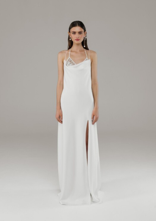 Один из универсальных вариантов из свадебной коллекции Ushatаva — платье-комбинация с красивым шлейфом, вечная классика для невест. Монументальность силуэта здесь обманчивая — создается с помощью второго слоя из трикотажной ткани, и в дальнейшем платье легко будет вписать в свой гардероб. А еще невесте можно не думать о том, что наряд помнется: комбинация сшита из уже мятого крепа. Иной, но тоже практичный подход демонстрирует бренд Tatyana Kochnova, который специализируется на вечерних и свадебных нарядах: они предлагают надеть под комбинацию лиф из кристаллов.