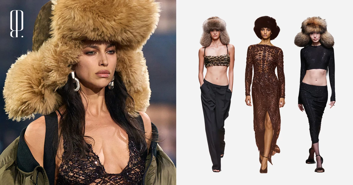 Однако, спору нет, самый эффектный способ носить ушанку прямо сейчас, в празднично-светский сезон, можно было подглядеть на дебютном показе Sashaverse Александра Терехова. Шапки-ушанки из переработанного меха енота, ставшие лейтмотивом коллекции, дополняли мерцающие и обнажающие спину топы со струящимися юбками, короткие-топы из леопардового меха и брюки на заниженной талии. Похожий трюк — ушанка + вечерний образ — мы наблюдали на шоу Dsquared2, где Ирина Шейк, облаченная в черное с посверкивающими бусинами платье-сетку, гордо несла на голове монструозного размера шапку из овчины. Словом, записывайте рецепт, если метите в предновогоднюю светскую хронику. А все ингредиенты мы уже собрали.