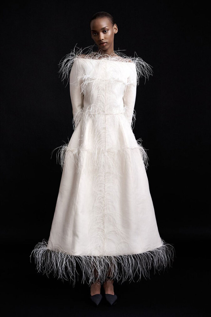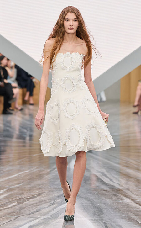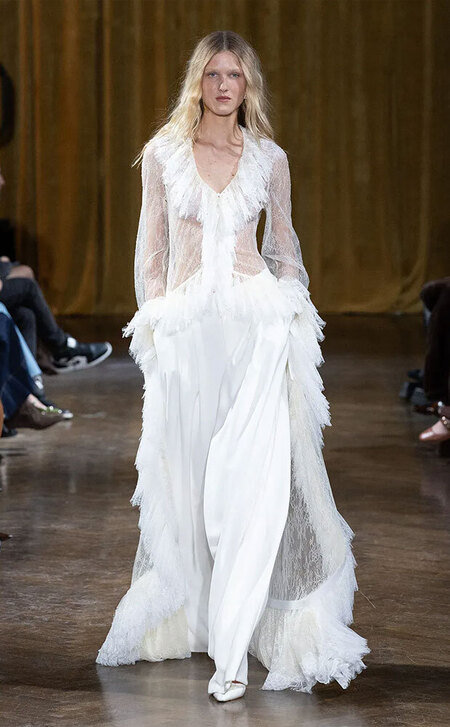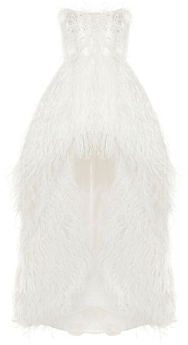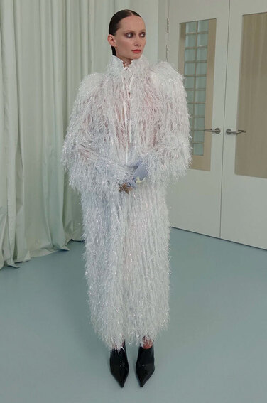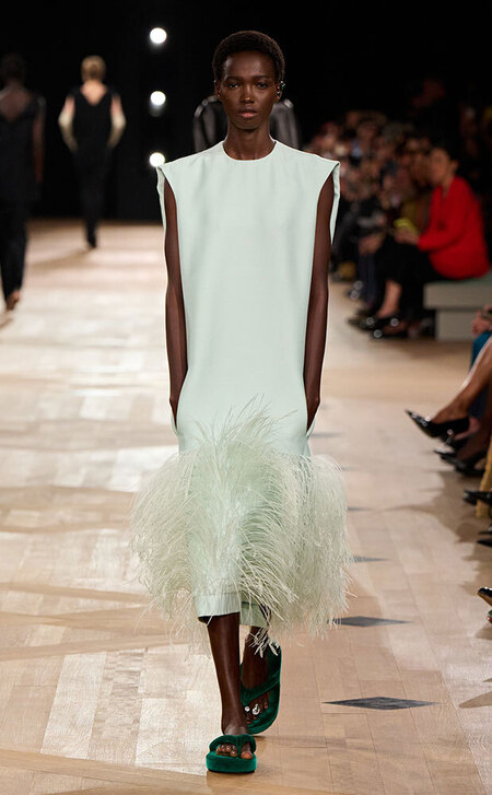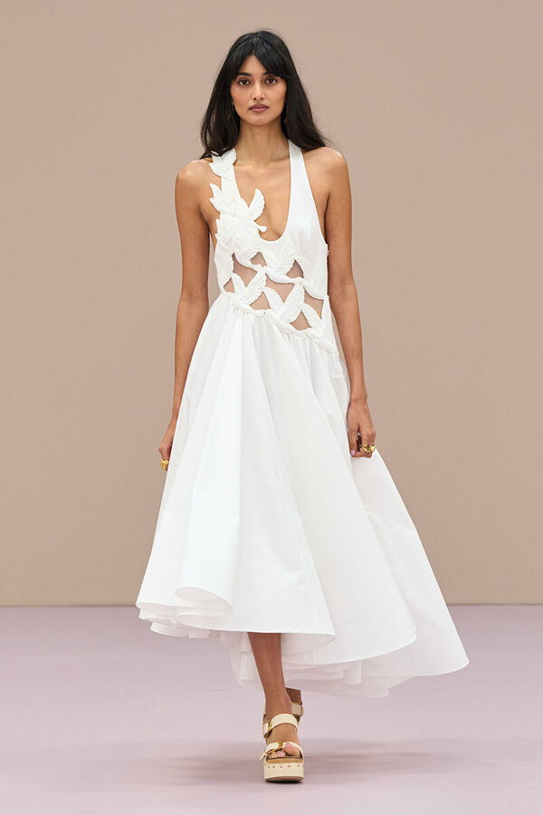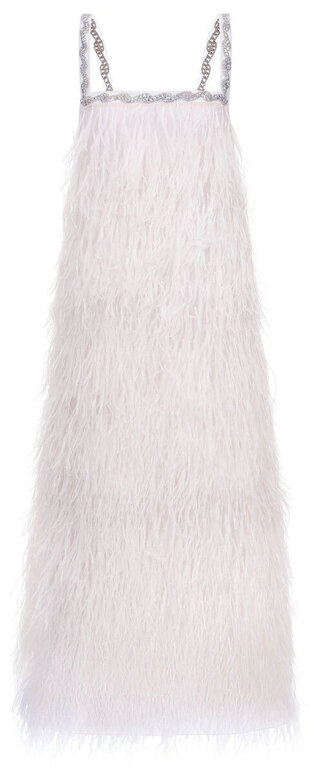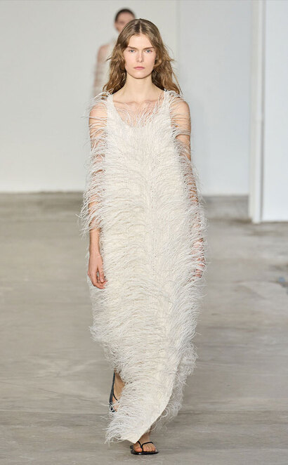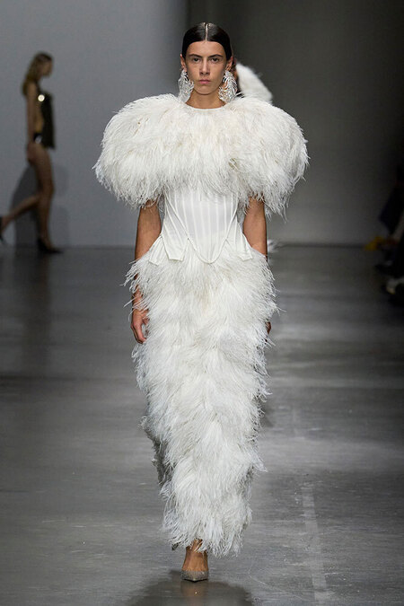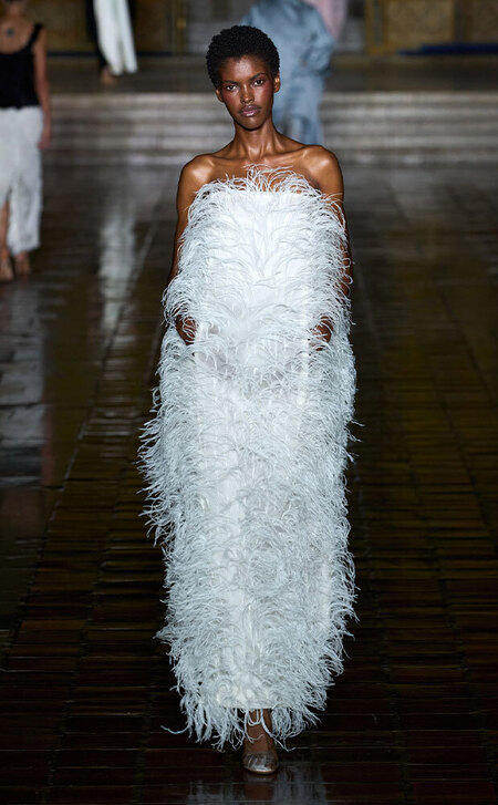 Тонкими и иногда длинными перьями в сезоне весна-лето 2026 дизайнеры расшивали и юбки, и топы, и, конечно, белые платья — как Пьерпаоло Пиччоли в Balenciaga. Декор не новый, но придающий нарядам особую, символическую, воздушность.