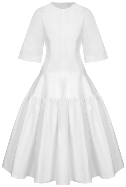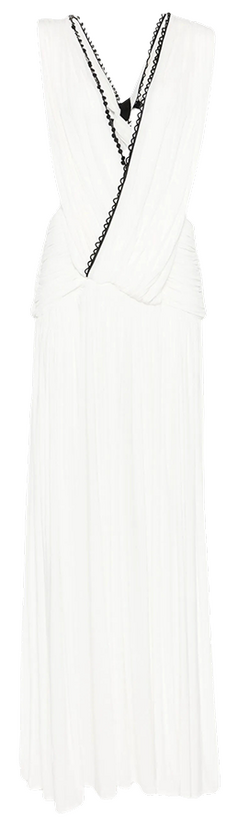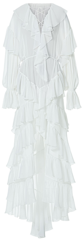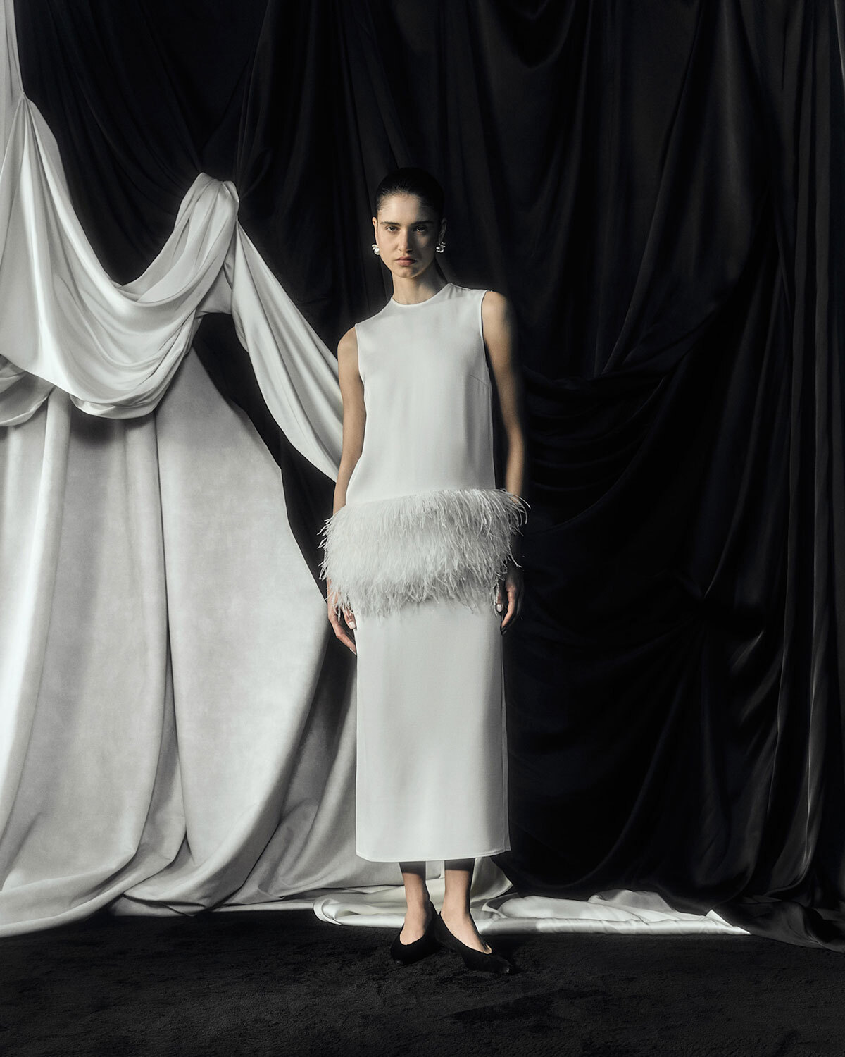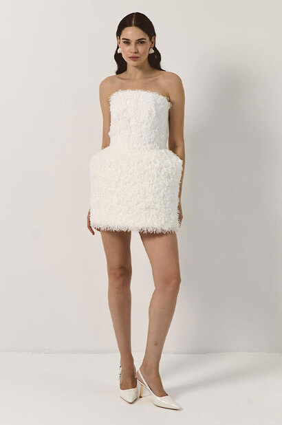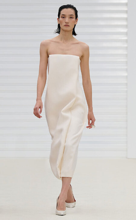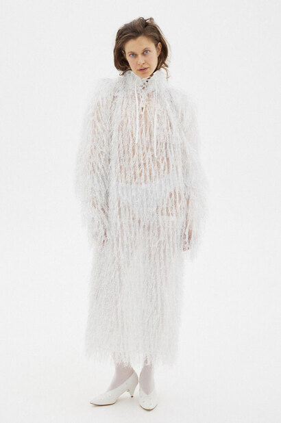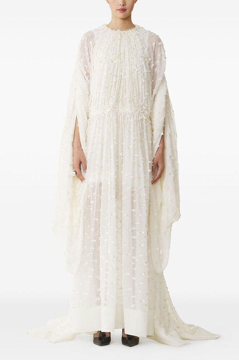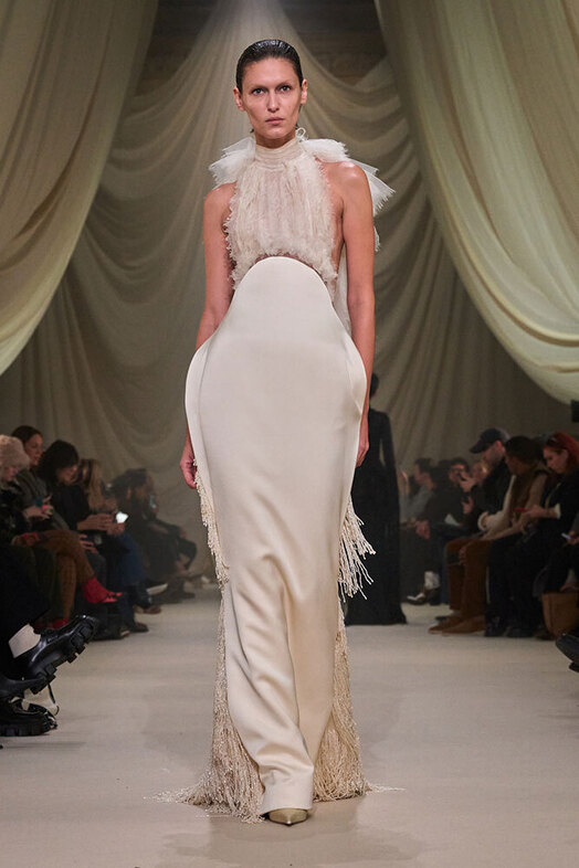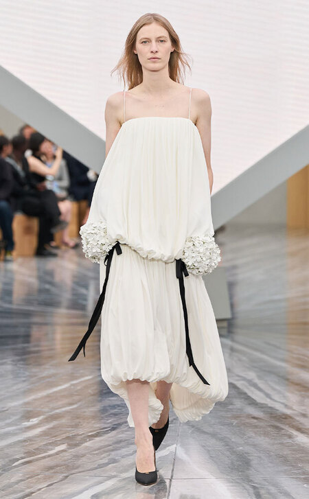 Тонкими и иногда длинными перьями в сезоне весна-лето 2026 дизайнеры расшивали и юбки, и топы, и, конечно, белые платья — как Пьерпаоло Пиччоли в Balenciaga. Декор не новый, но придающий нарядам особую, символическую, воздушность.