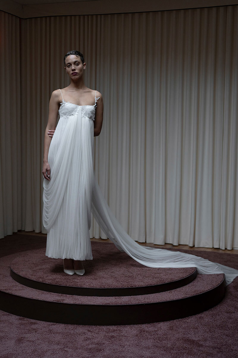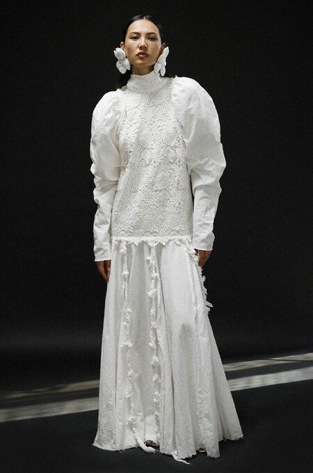 Тем временем основательница бренда Rasario Расида Лакоба заметила, что все больше невест отказываются от пышных торжеств в пользу камерных вечеров: «И как следствие платья выбирают более лаконичные». А значит, без сложного декора, мудреного силуэта и армянского кортежа. «На передний план выходит ткань и то, как она держит форму», — соглашается основательница марки Mu:s Лена Максимова.