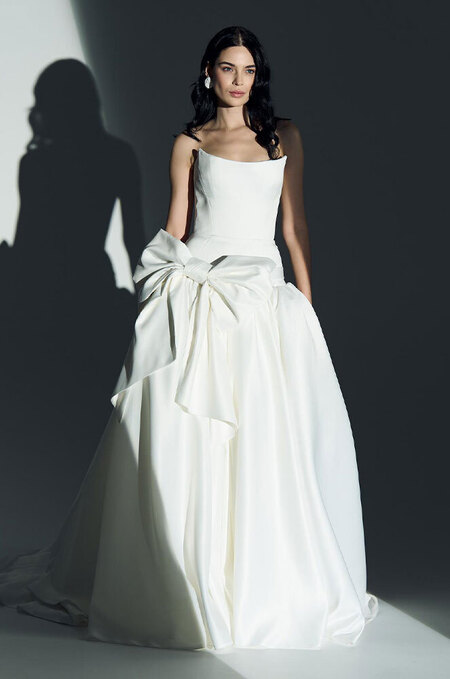 Мода на низкую талию, по сути, перекочевала из трендов сезона весна-лето 2026. Такие свадебные платья смотрятся расслабленно — но в меру. К тому же юбка может быть вполне объемной — вдруг вы хотите быть хотя бы наполовину принцессой.