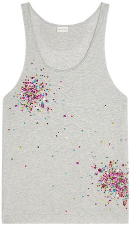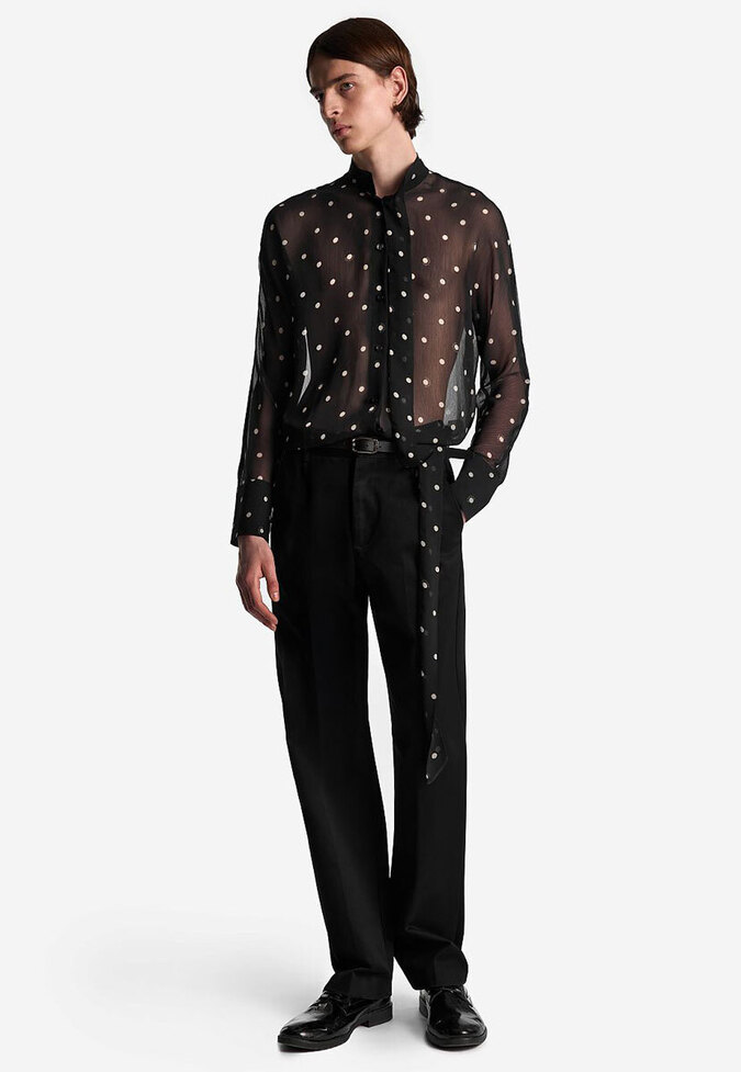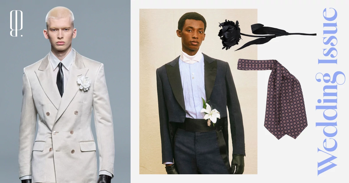 «Именно детали сегодня, как мне кажется, и делают мужской свадебный образ по-настоящему интересным, — говорит Хабиб. — От избыточной декоративности я бы точно отказался, но один сильный акцент — всегда хорошая идея. И здесь я бы снова вернулся к Луи Гаррелю в кампейне Dior весна-лето 2026: формально на нем все очень классическое, почти аскетичное — черный костюм, белая сорочка. Но этот однотонный шелковый шейный платок делает образ чуть более сложным и артистичным». Шелковые платки мы встречаем и у Saint Laurent: с принтом polka dot, они выглядывают из-под воротников сорочек. Более брутальный вариант предлагает вслед за Хайдером Акерманном Рамиль Шакирзянов — галстук из черной кожи.
