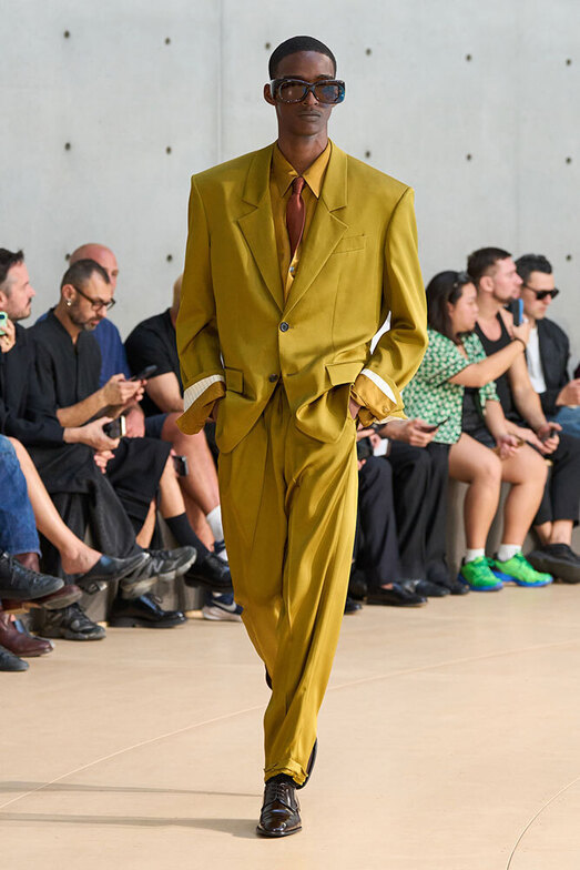 В хорошем смысле Дмитрий Логинов и Рамиль Мустафаев выделяют коричневый, или Tobacco brown, как в весенне-летней коллекции Brioni. Рамиль Шакирзянов добавляет на мудборд костюмы из коллекции Saint Laurent того же сезона — цвета поблескивающих на солнце оливок, еще и в сочетании с лососевой сорочкой.