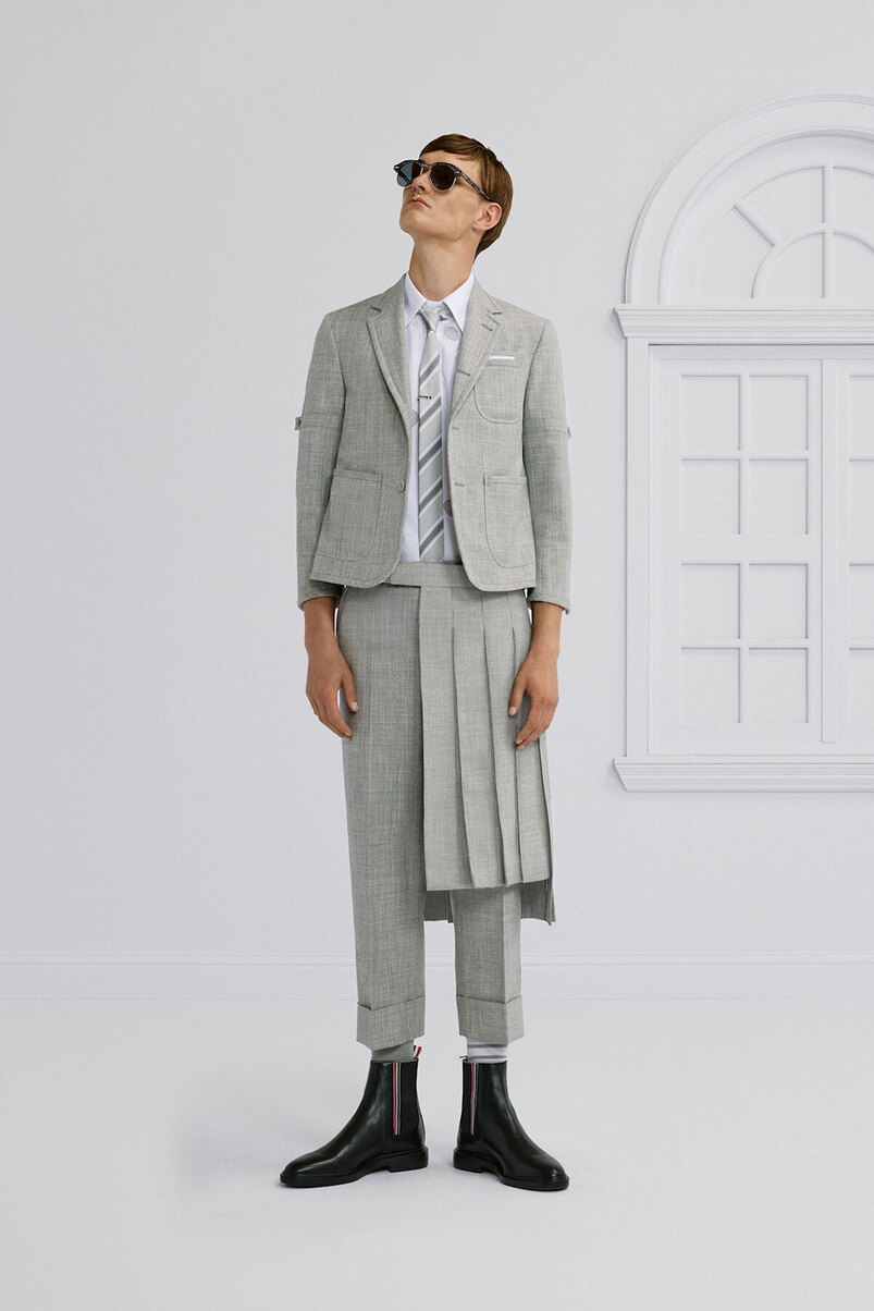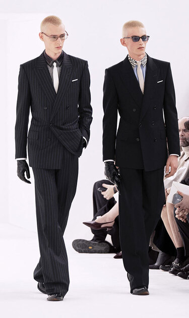 Тем, кто, как выражается стилист Рамиль Шакирзянов, «про индивидуальность и характер» — то есть не противится экспериментам, — он напоминает про костюмы Тома Брауна: например, пиджак с рукавами ¾ и брюки с фартуком в складку из коллекции весна-лето 2026. А еще стилист рекомендует посмотреть новый клип Йе и Трэвиса Скотта Father, срежиссированный Бьянкой Цензори: в нем рэперы по очереди идут под венец в «двойках», притом из серой кожи с отливом — этакая вариация одиозного костюма из 1990-х дизайнера Эллиота Гриффиса. Но о цвете — в следующем пункте.