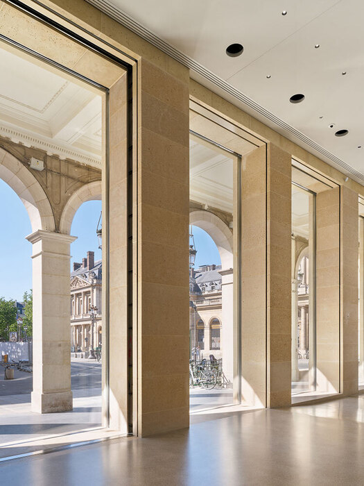 Притцкеровский лауреат Нувель отталкивается в работе от контекста места и климата, любит управлять светом через модифицируемые фасады зданий и вообще сильно уважает пространства-трансформеры. Таков, например, парижский Институт арабского мира (Institut du Monde Arabe), фасад которого сложен из светочувствительных диафрагм в форме традиционных арабских солнцезащитных решеток «машрабия» и фильтрует свет подобно затвору камеры. Таков Лувр Абу-Даби на острове Саадият с центральным куполом-решеткой, который повторяет тень, отбрасываемую переплетающимися пальмовыми листьями в рощах оазиса Аль-Айн. Работать с Cartier Нувель начал еще в девяностые, когда спланировал для ювелиров здание часового завода в Швейцарии. Затем он спроектировал первое здание фонда на бульваре Распай, и вот пик доверия — флагманское хранилище арт-коллекции напротив Лувра, в окружении Пале-Рояля, музеев, театров и министерств. Для фонда, который строит программу на разговоре искусства с городом, переезд в бывший магазин становится задачей по работе с памятью места. В официальной концепции это звучит как миссия сделать фонд ближе Парижу, горожанам и туристам, вплести новые формы искусства в историческую ткань столицы и перепридумать музеологию для реалий XXI века.