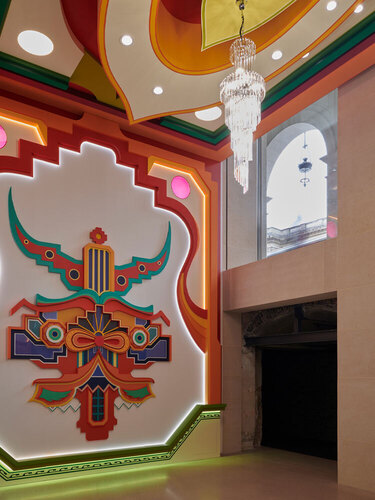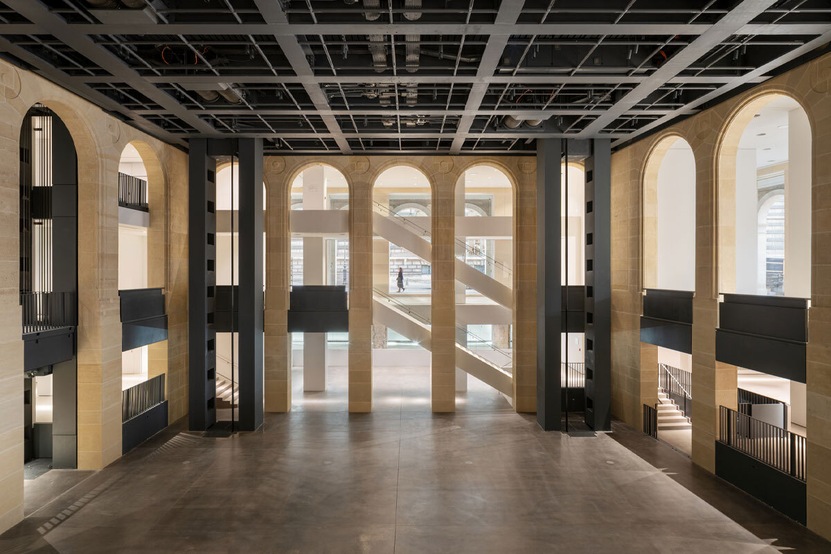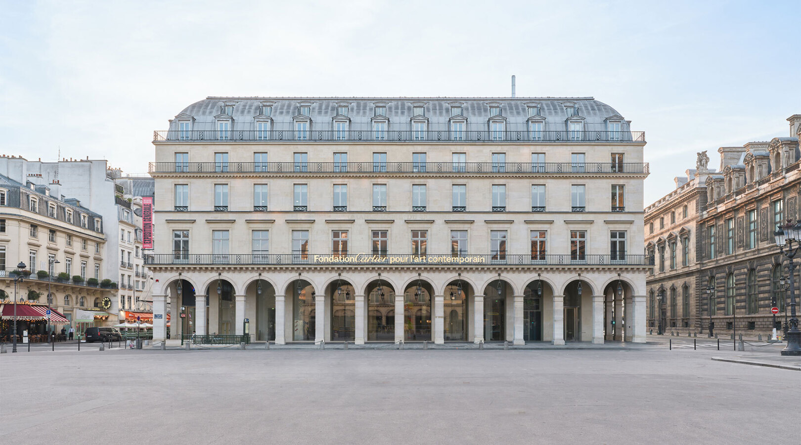 Что же за здание теперь принадлежит Фонду Cartier, который переехал в самое сердце Парижа с бульвара Распай, в Первый округ из Четырнадцатого, а до того обретался в предместье Парижа, Жуи-ан-Жозас? Гигантское здание эпохи барона Османна занимает целый квартал между улицей Риволи, площадью Пале-Рояля, улицами Сент-Оноре и Маренго. Grand Hôtel du Louvre построили к первой Всемирной выставке 1855 года, устроенной Наполеоном III в пику лондонской Великой выставке 1851 года. Самый большой отель Европы с лифтом (новинка по тем временам!) плюс один из первых парижских универмагов (Grands Magasins du Louvre вдохновлялся Эмиль Золя в «Дамском счастье») должен был принять поток посетителей выставки и дополнительно монетизировать его за счет торговых площадей. В 1975 году здание купил британский пенсионный фонд и начал его конверсию в деловой центр; в 1978-м на нижних уровнях открылись антикварные ряды Louvre des Antiquaires, работавшие до 2016 года. Сегодня здание принадлежит испано-французским девелоперам Colonial — SFL и известно как Louvre Saint-Honoré; 20 000 м² на цоколе, первом и втором этажах отданы Фонду Cartier. Публике доступно 8500 м², из них 6500 м² — выставочные. Историческая оболочка здания сохранена, а внутренние объемы пересобраны Нувелем.