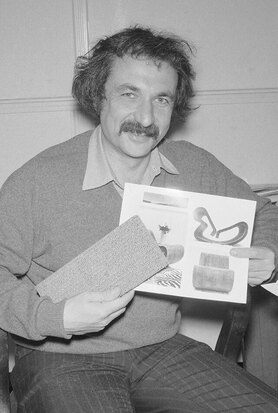 Фрэнк Гери держит образец гофрированного картона, из которого изготавливается его мебель, 1972