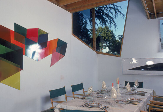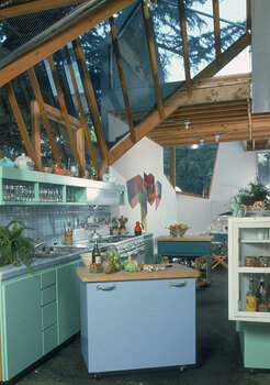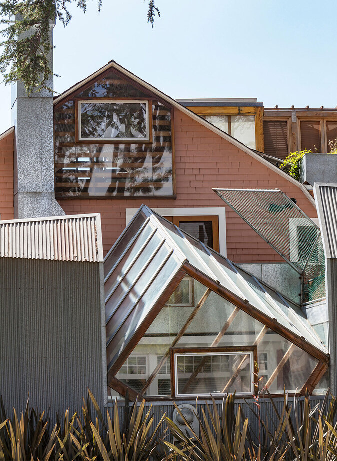 Первая — разделение пространств на отдельные архитектурные блоки: Гери начал проектировать простые однокомнатные постройки, а затем соединять их между собой и экспериментировать с этими соединениями. Спальни, мастерские, хозяйственные части домов в его проектах 1960-х становились самостоятельными формами, которые соединялись между собой с помощью лестниц, пандусов и мостов, как, например, в доме для еще одного художника Рона Дэвиса.
