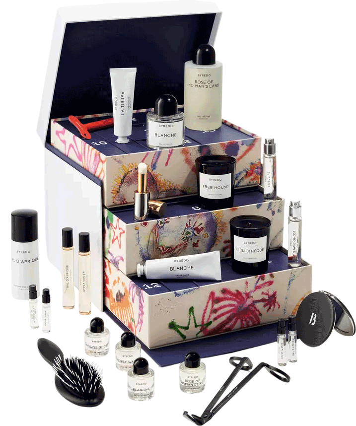 Byredo не просто разложили миниатюры по окошкам, а сделали внушительный трехъярусный бокс с 24 подарками. Несколько свечей и триммер для фитиля, духи в разных форматах, ароматические масла, кремы для рук, мини-гели для душа, спреи для волос — полный набор, чтобы провести зиму в окружении приятных запахов.