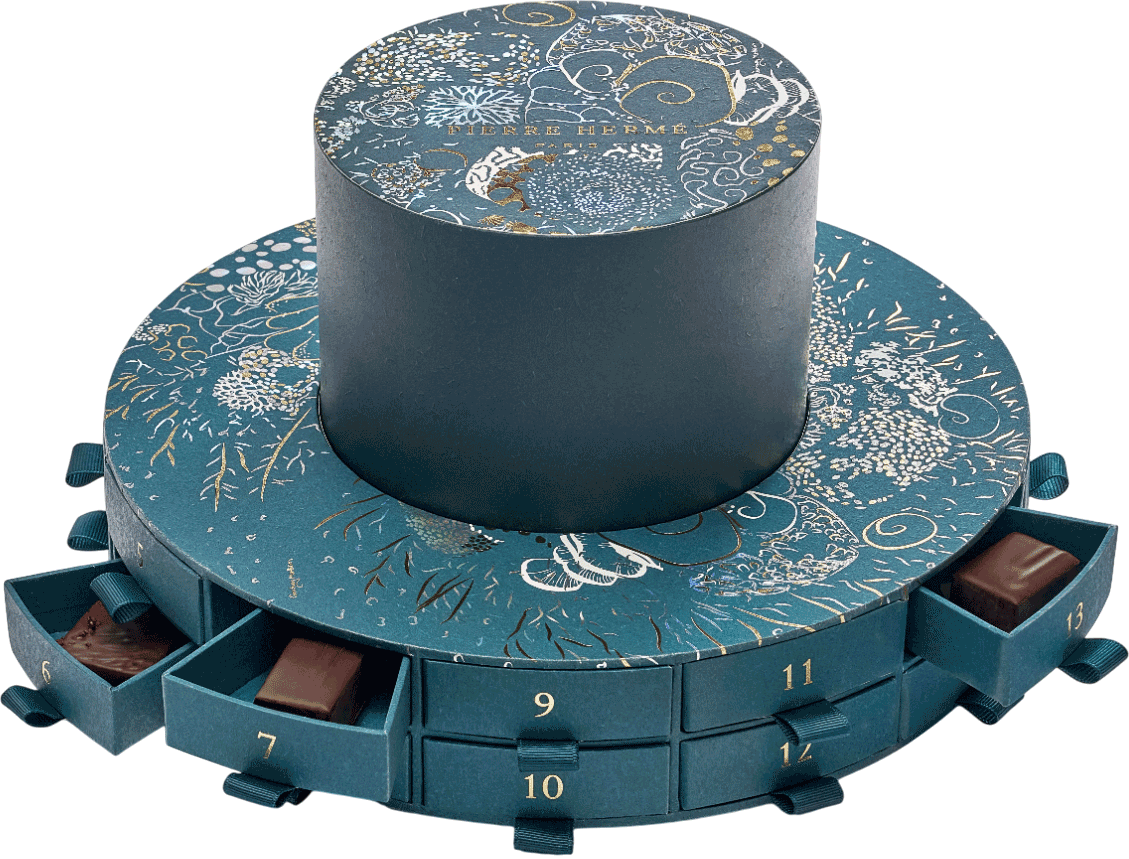Французский шоколатье Пьер Эрме каждый год выпускает адвент-календарь неописуемой красоты, обычно в содружестве с художниками. В этом году дизайн разработала Кортни Мэтиссон, американский морской биолог и керамист, которая в своих работах вдохновляется образами подводного мира. В центре круга — фарфоровый «риф», вокруг — пронумерованные коробочки с шоколадными конфетами с разными начинками: миндаль, фундук, пралине, фрукты и многое другое.