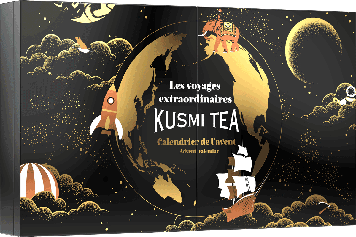 Огромная коробка осчастливит всех, кто в детстве любил Жюля Верна: адвент оформлен в стиле путевого дневника, который вполне мог бы принадлежать кому-нибудь из его персонажей. 24 окошка, за которыми спрятаны 2 миниатюрных чая (La Desert и Glogg), 18 пакетиков с зеленым, черным, белым и травяным чаями, ситечко для чая и чайное желе Tropical White.