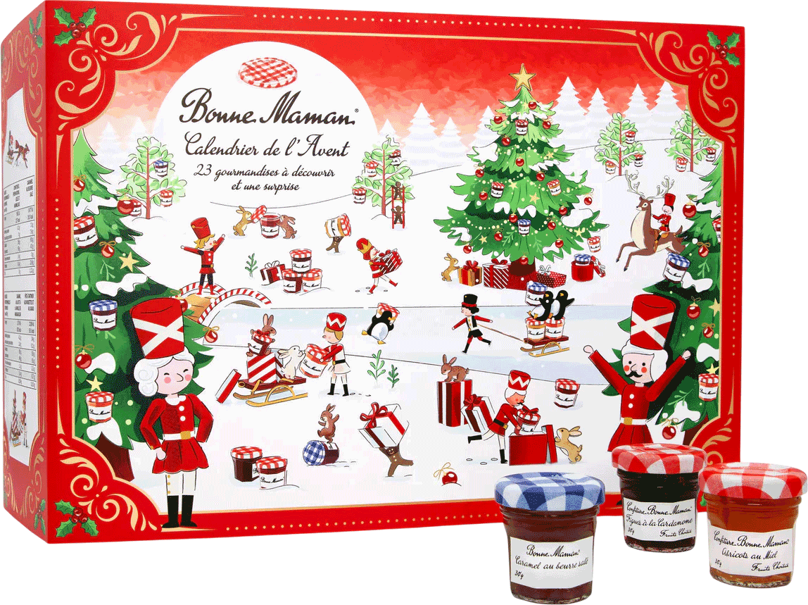 Один из самых любимых во всем мире адвентов — от производителя джемов Bonne Maman (и его можно встретить на наших маркетплейсах): 24 маленькие баночки с разными джемами и вареньями в симпатичной расписной коробке и со вкусами от «клубника-ревень» до «кофе-карамель».