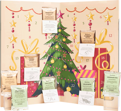 Сеть кофейно-чайных магазинов выпустила чайный адвент «Волшебство леса». В красивой коробке скрываются 24 чайных пакетика с разными вкусами, от классического ассама и «английского завтрака» до «мятного бриза» и зеленого чая «в тени инжирного дерева».