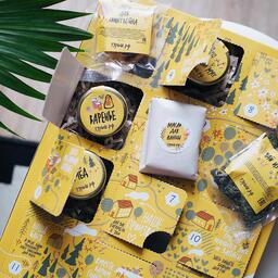 Марка, породившая много лет назад моду на крем-мед и возрождение деревень (собственно Малый Турыш по-прежнему центр производства этого продукта), представляет адвент-календарь, в котором собраны съедобные и не только дары природы: саше с солью и травами, чаи из трав, варенье, аромасвечи и так далее. На коробке как раз кратко история бренда и изложена. Есть усеченный вариант «Новогодние каникулы» на 10 предметов.