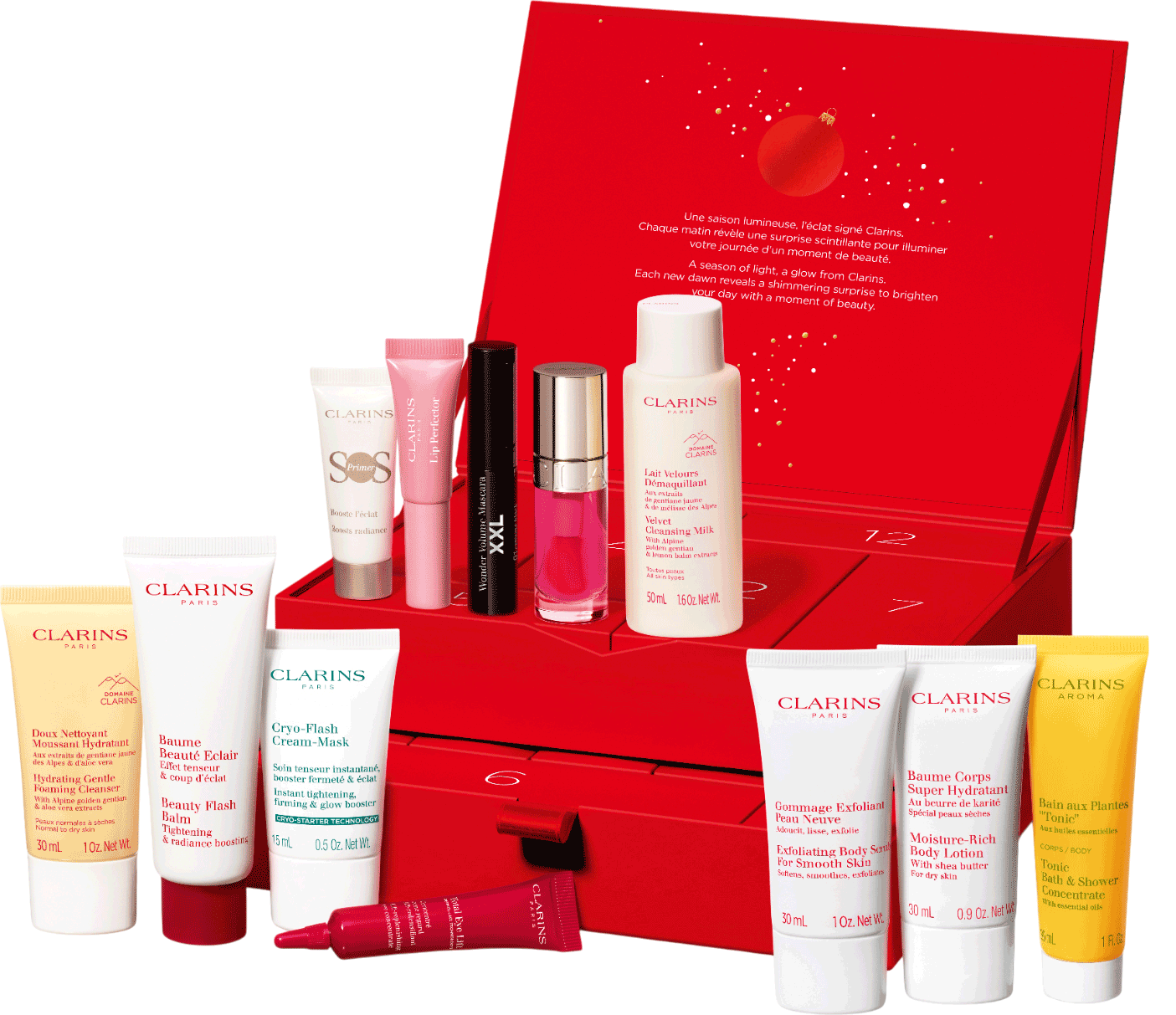 Если большой адвент-календарь — это марафон, то этот от Clarins, скорее, спринт — окошек всего 12. Зато в них прячутся главные бестселлеры бренда для ухода за кожей и макияжа. Есть, например, очищающий крем для лица, освежающая маска и увлажняющий бальзам, отшелушивающий крем для тела и пена для ванны, тушь и — хит сезона — масло для губ.