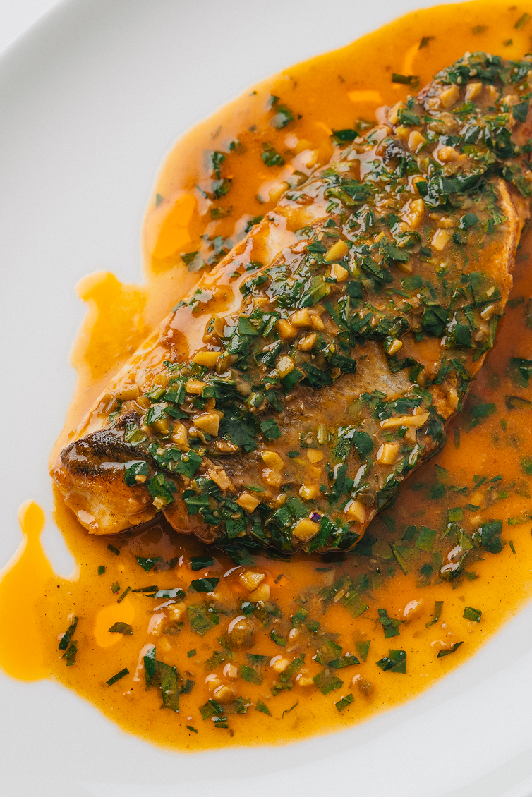 5. В самом конце при необходимости добавьте еще немного сливочного масла, чтобы «затянуть» соус и придать ему глянец. Соус должен плотно обволакивать рыбу, а кожа оставаться хрустящей.