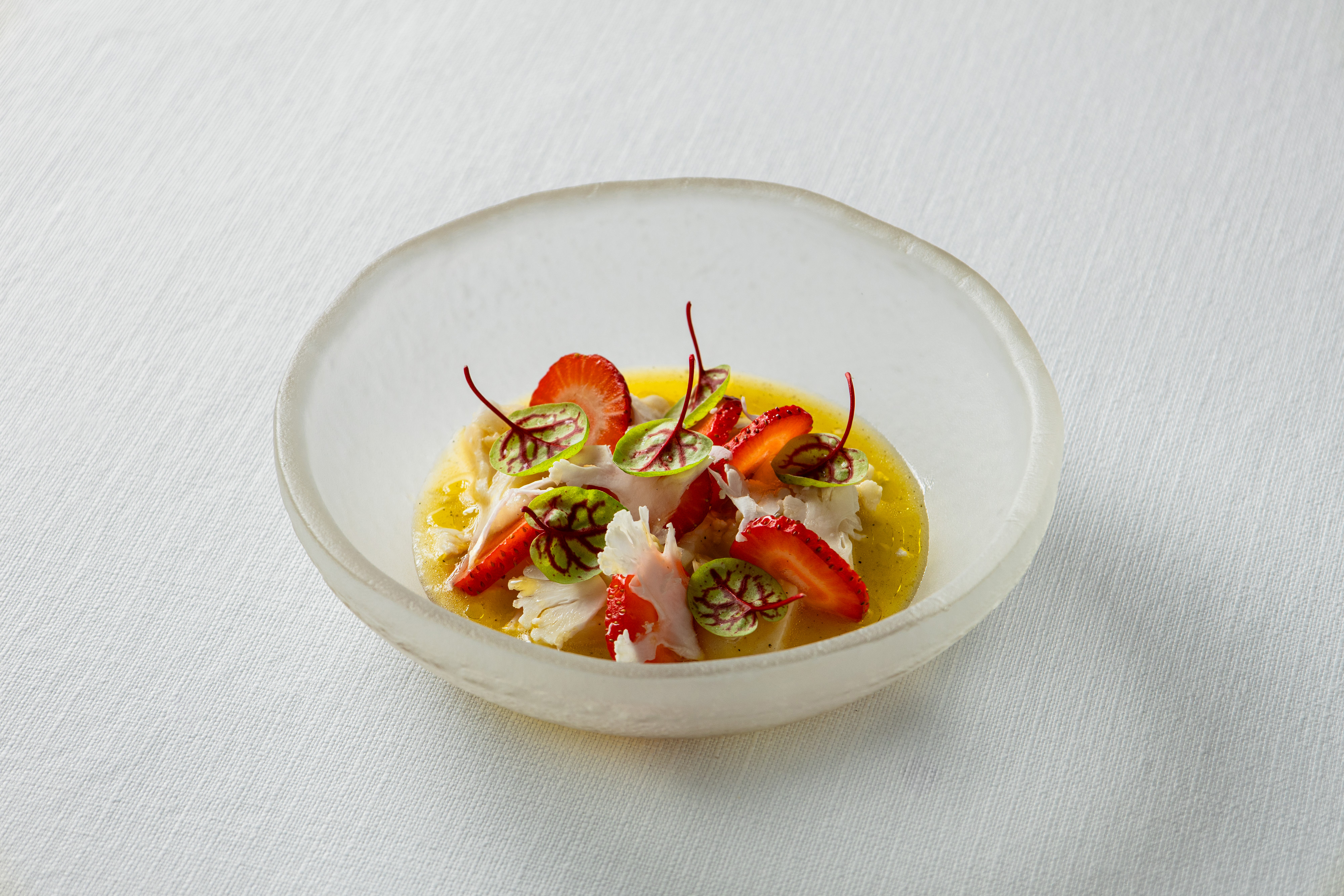 «Нежирный муксун ценится за свой прозрачный, деликатный вкус — как в строганине. Его дополняют хрустящие слайсы цветной капусты и свежий фруктовый акцент в виде хурмы или клубники. Цитрусовая заправка подчеркивает вкус рыбы, не утяжеляя блюдо и сохраняя ощущение свежести».