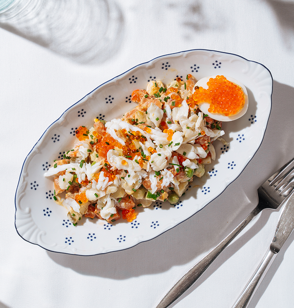 Оливье с лососем и авокадо