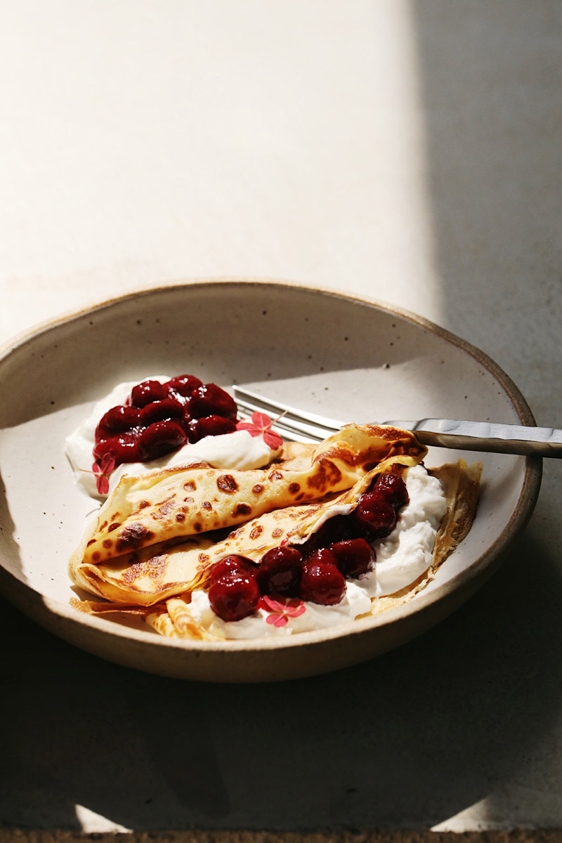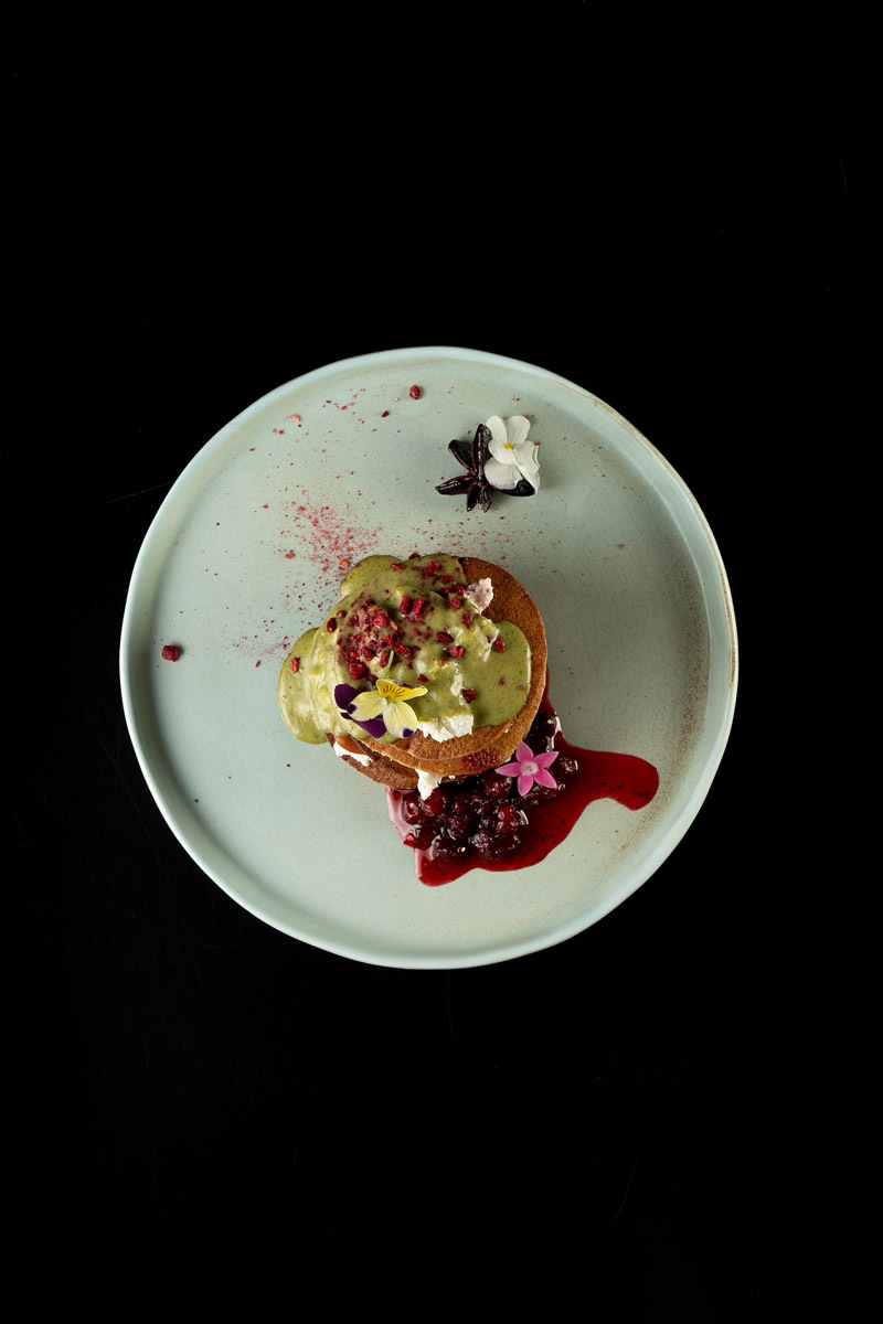 Что: Ягодный блин с вишневым компотом, страчателлой, греческим йогуртом и микрозеленью