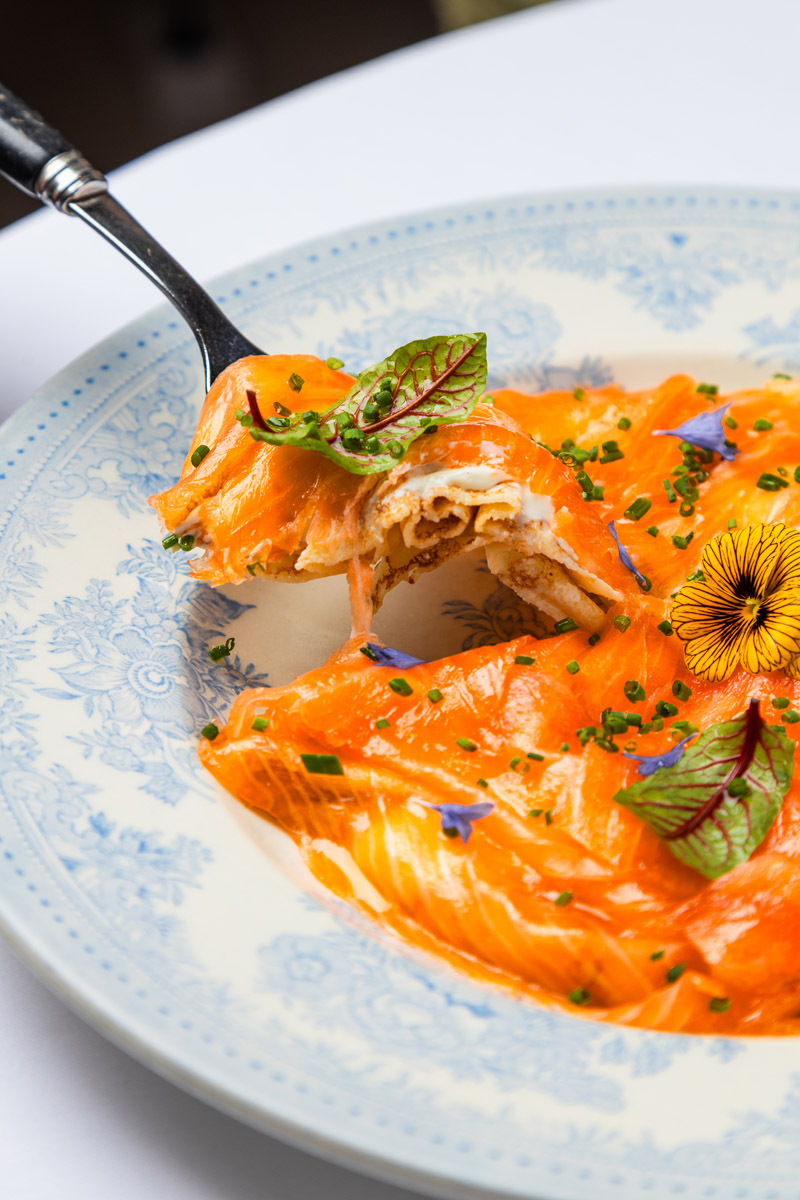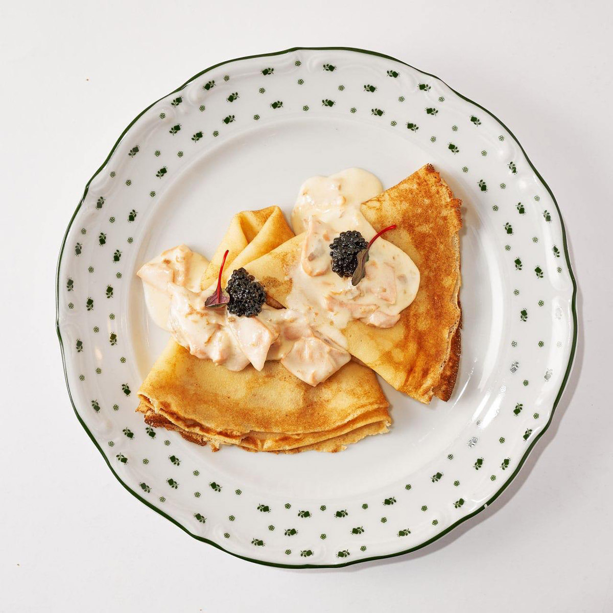 Что: Блины с форелью в сливочном соусе с икрой палтуса